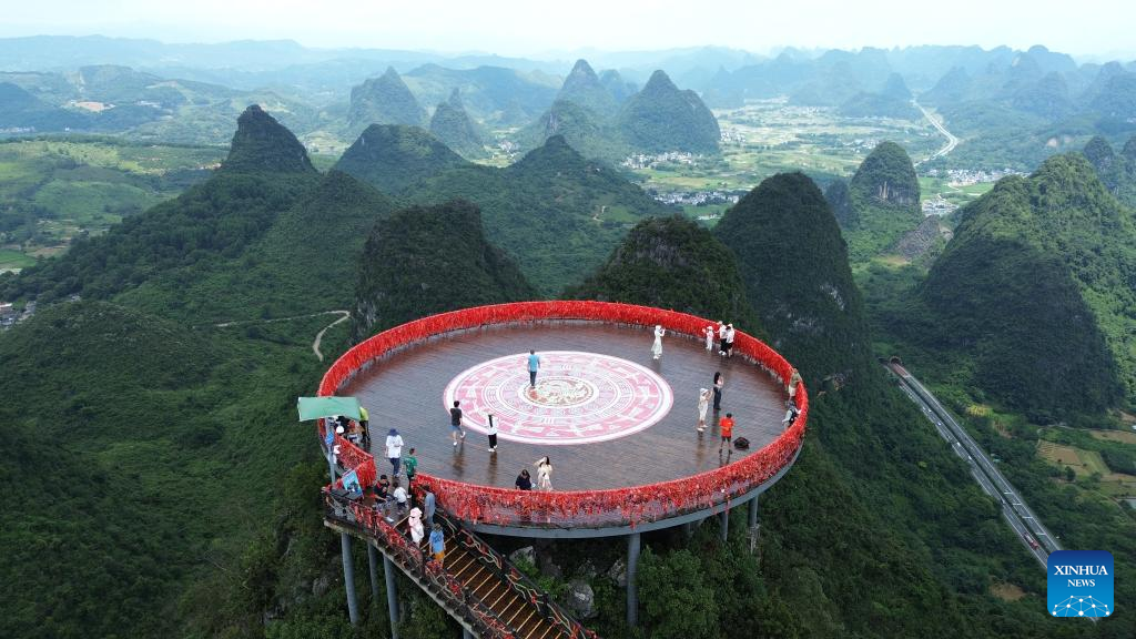 An aerial drone photo taken on July 13, 2024 shows tourists enjoying the mountain view on a viewing platform in Yangshuo County, Guilin City, south China's Guangxi Zhuang Autonomous Region. Many tourist destinations across China have recently seen a surge in visitors as the country enters its peak summer tourist season. (Photo by Liao Zuping/Xinhua)