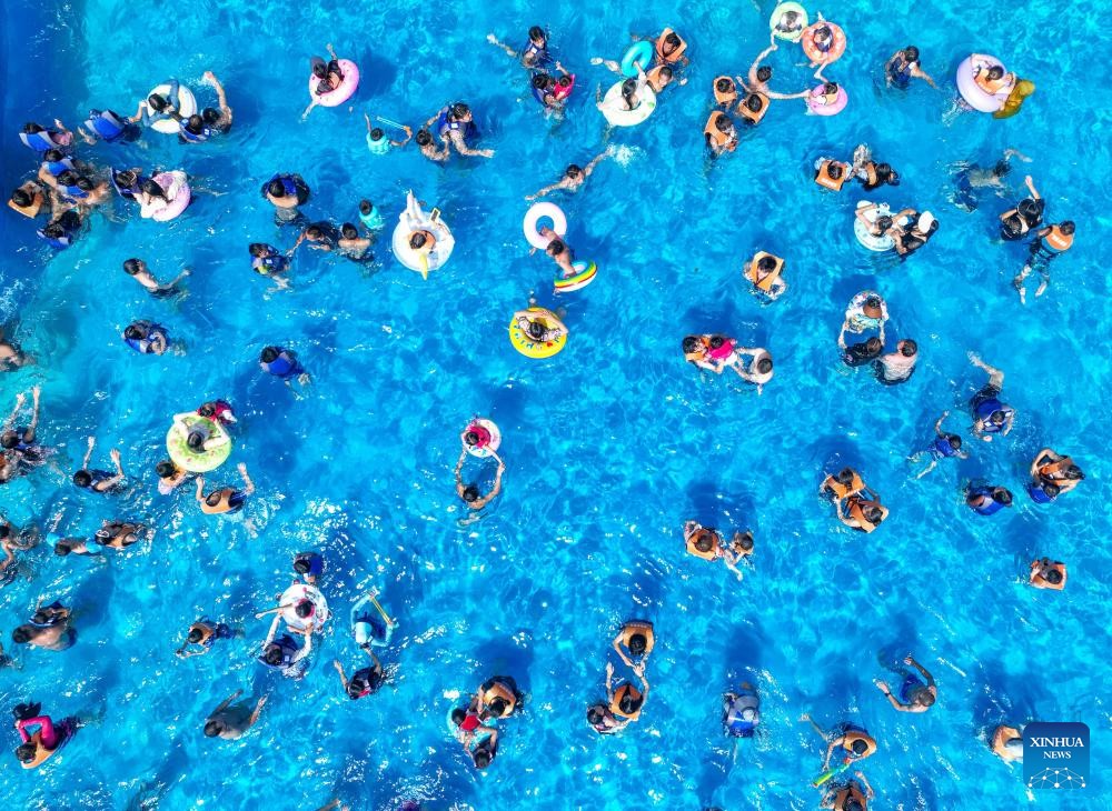 An aerial drone photo taken on July 14, 2024 shows people cooling off at a water park in Daoxian County, Yongzhou City, central China's Hunan Province. Many tourist destinations across China have recently seen a surge in visitors as the country enters its peak summer tourist season. (Photo by Jiang Keqing/Xinhua)