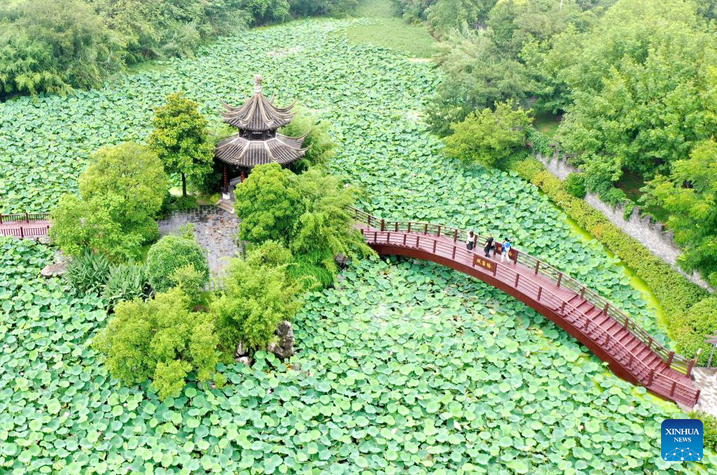 An aerial drone photo taken on July 14, 2024 shows tourists visiting a garden in Dinghuo Town, Yangzhou City, east China's Jiangsu Province. Many tourist destinations across China have recently seen a surge in visitors as the country enters its peak summer tourist season. (Photo by Ren Fei/Xinhua)