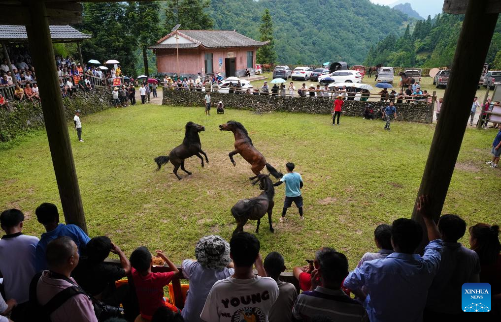 People watch the horse fighting competition in Xiaosang Miao Village of Antai Town, Rongshui Miao Autonomous County, south China's Guangxi Zhuang Autonomous Region, July 13, 2024. Many tourist destinations across China have recently seen a surge in visitors as the country enters its peak summer tourist season. (Photo by Long Linzhi/Xinhua)