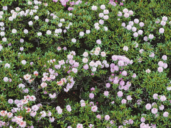 Alpine rhododendrons, belonging to the Ericaceae family, have dark green leaves and deep veins with diverse flower colors, and some varieties are able to endure temperatures as low as -28 to -25 degrees Celsius.