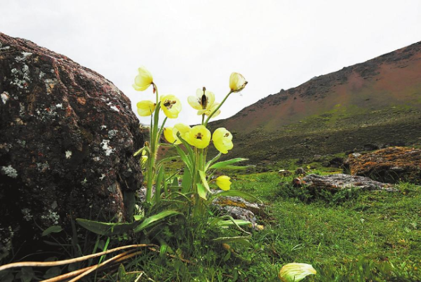 At 4,410 meters, in a high-altitude meadow among rocky outcrops, the Meconopsis pseudointegrifolia Prain blooms profusely with bright yellow petals.