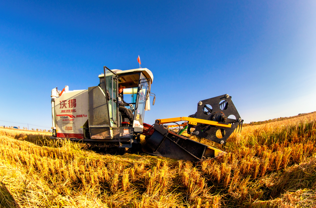 An agricultural machine harvests rice on the Tailai Farm in Heilongjiang province. [Photo by Feng Xian/For chinadaily.com.cn]