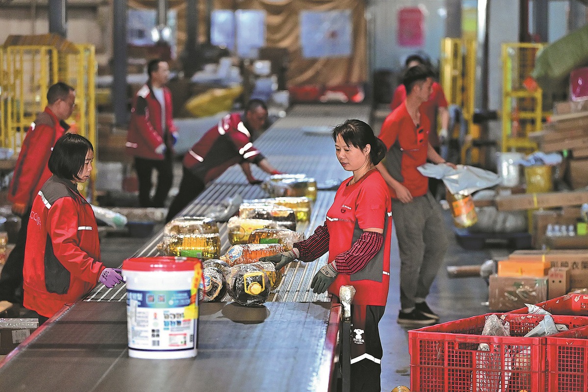 Workers sort express packages on an intelligent sorting line in Nanchang, Jiangxi province, on Nov 3. ZHU HAIPENG/FOR CHINA DAILY