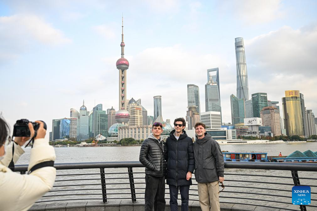 Foreign tourists visit the Bund in east China's Shanghai, Nov. 30, 2024. Expanding visa-free policy is a milestone in China's journey toward greater openness and also shows its confidence on the global stage. So far, 38 countries enjoy unilateral visa-free access, and the maximum stay for visitors has been extended to 30 days as of Nov. 30.