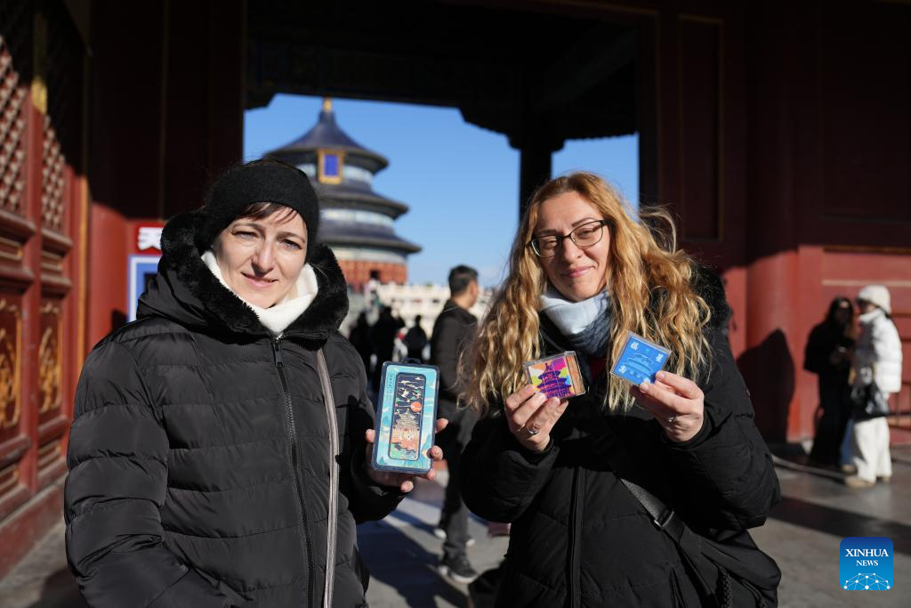 Tourists from Britain pose for photo at Tiantan (Temple of Heaven) Park in Beijing, capital of China, Dec. 5, 2024. Expanding visa-free policy is a milestone in China's journey toward greater openness and also shows its confidence on the global stage. So far, 38 countries enjoy unilateral visa-free access, and the maximum stay for visitors has been extended to 30 days as of Nov. 30.