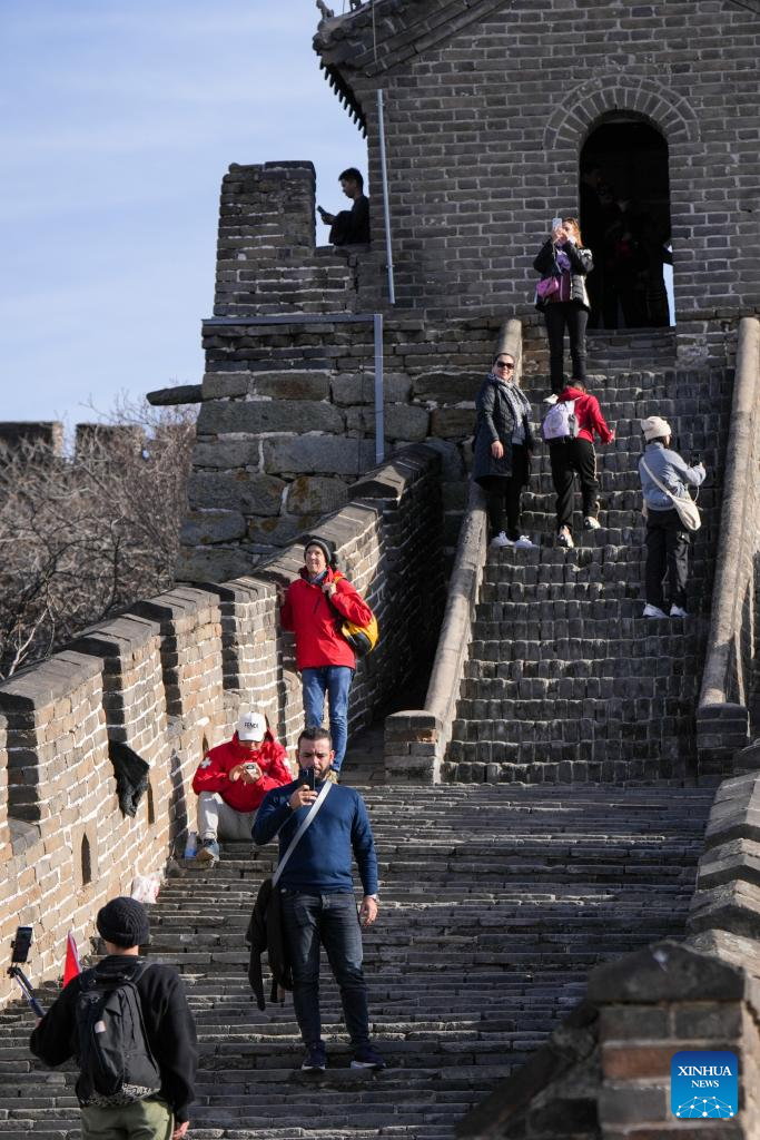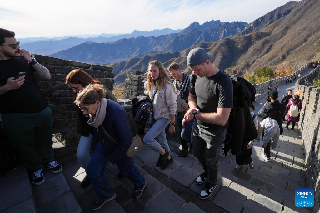 Foreign tourists visit Mutianyu section of the Great Wall in Beijing, capital of China, Nov. 4, 2024. Expanding visa-free policy is a milestone in China's journey toward greater openness and also shows its confidence on the global stage. So far, 38 countries enjoy unilateral visa-free access, and the maximum stay for visitors has been extended to 30 days as of Nov. 30.