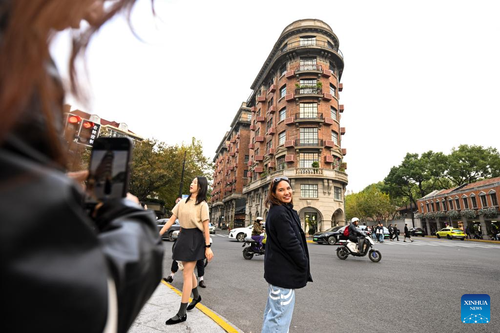 A tourist from Thailand poses for photo in front of the Wukang Building in east China's Shanghai, Dec. 3, 2024. Expanding visa-free policy is a milestone in China's journey toward greater openness and also shows its confidence on the global stage. So far, 38 countries enjoy unilateral visa-free access, and the maximum stay for visitors has been extended to 30 days as of Nov. 30.