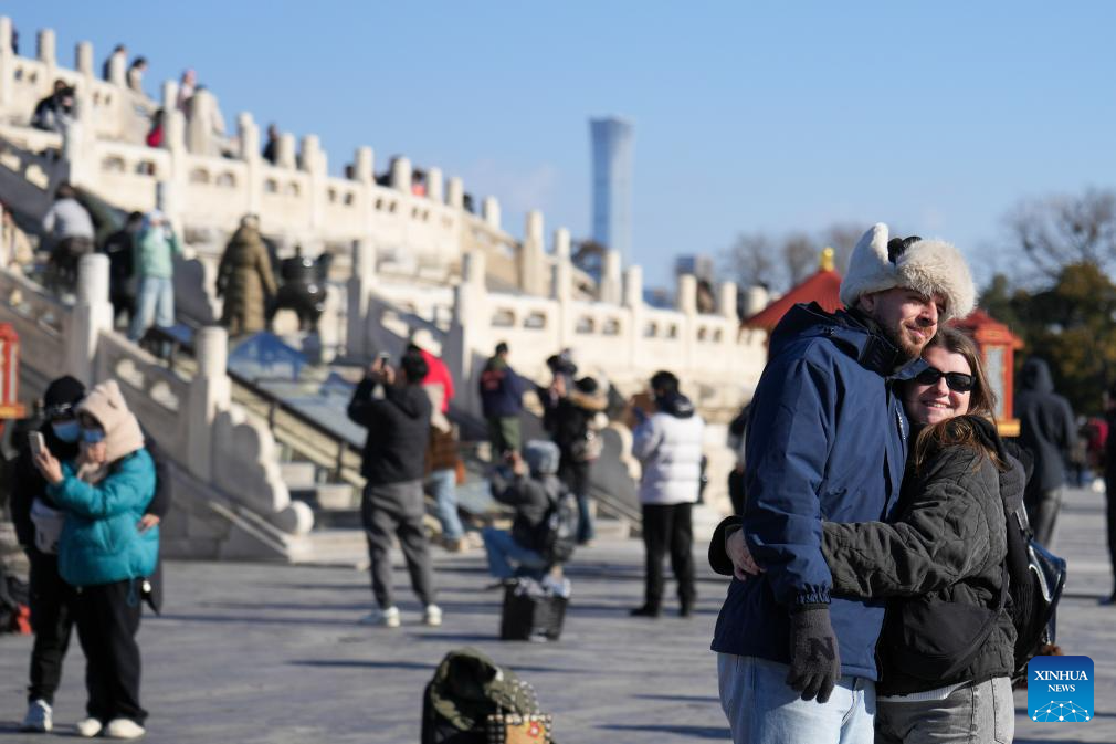 Foreign tourists pose for photos at Tiantan (Temple of Heaven) Park in Beijing, capital of China, Dec. 5, 2024. Expanding visa-free policy is a milestone in China's journey toward greater openness and also shows its confidence on the global stage. So far, 38 countries enjoy unilateral visa-free access, and the maximum stay for visitors has been extended to 30 days as of Nov. 30.