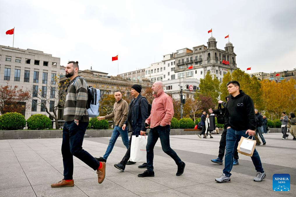 Tourists from Russia walk on the Bund in east China's Shanghai, Dec. 4, 2024. Expanding visa-free policy is a milestone in China's journey toward greater openness and also shows its confidence on the global stage. So far, 38 countries enjoy unilateral visa-free access, and the maximum stay for visitors has been extended to 30 days as of Nov. 30.