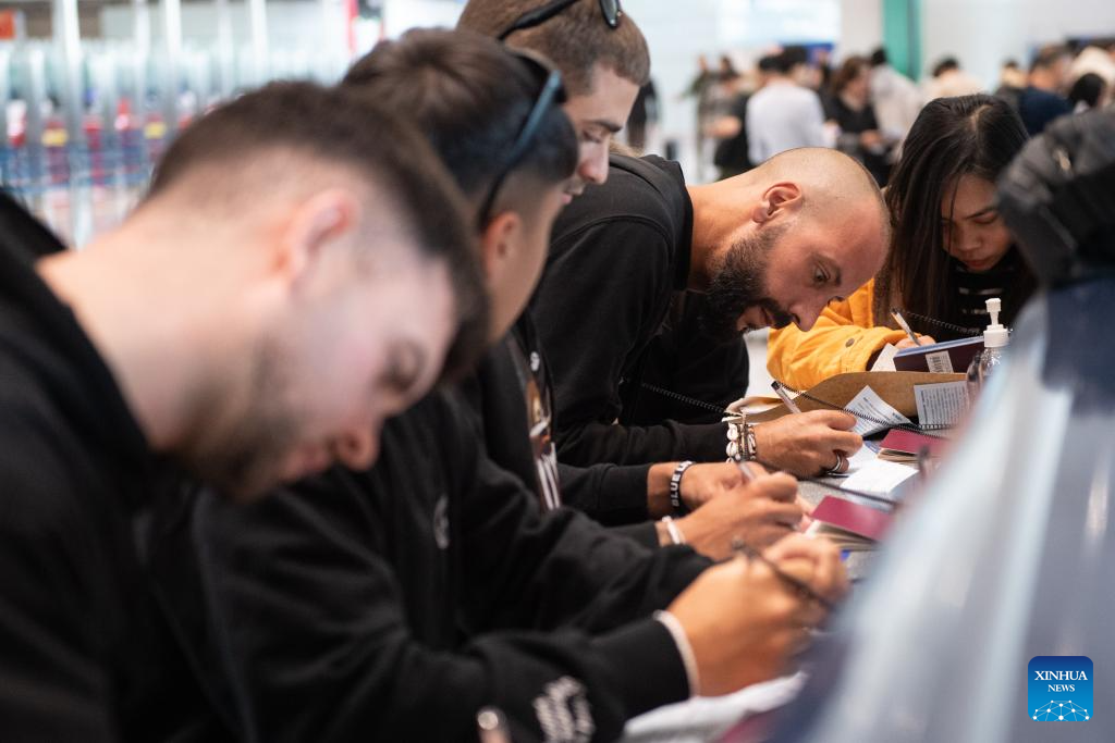Foreign tourists fill in entry cards at Beijing Capital International Airport in Beijing, capital of China, Dec. 4, 2024. Expanding visa-free policy is a milestone in China's journey toward greater openness and also shows its confidence on the global stage. So far, 38 countries enjoy unilateral visa-free access, and the maximum stay for visitors has been extended to 30 days as of Nov. 30.
