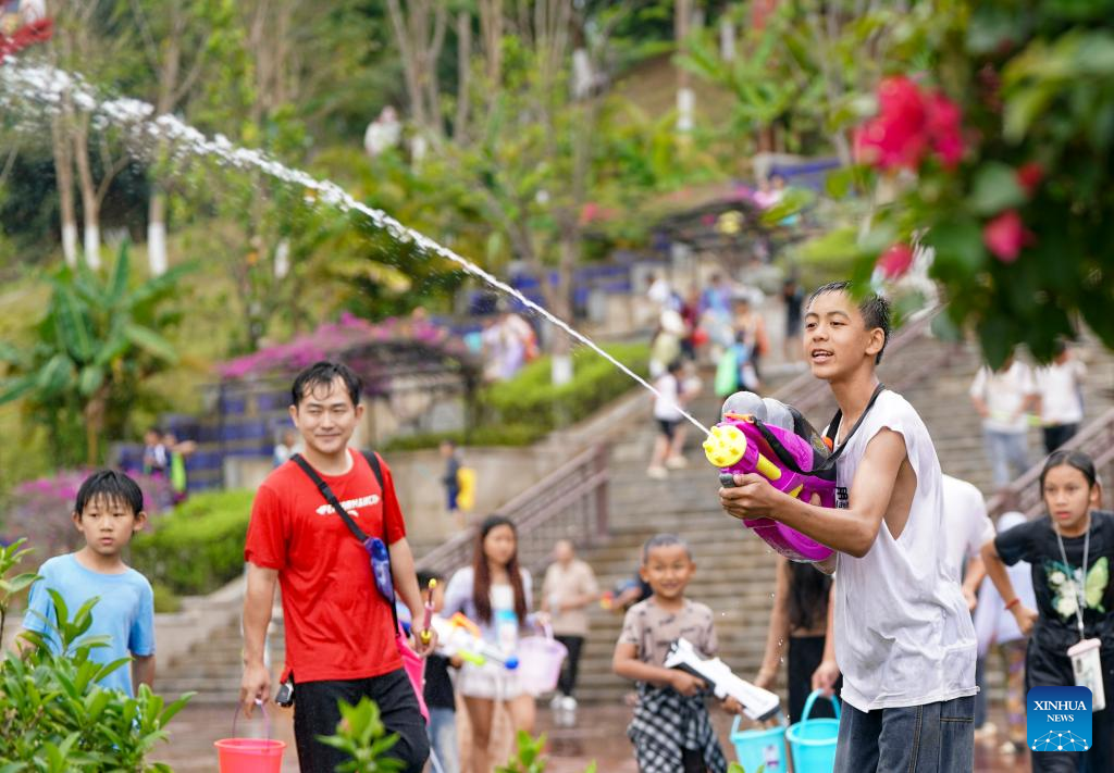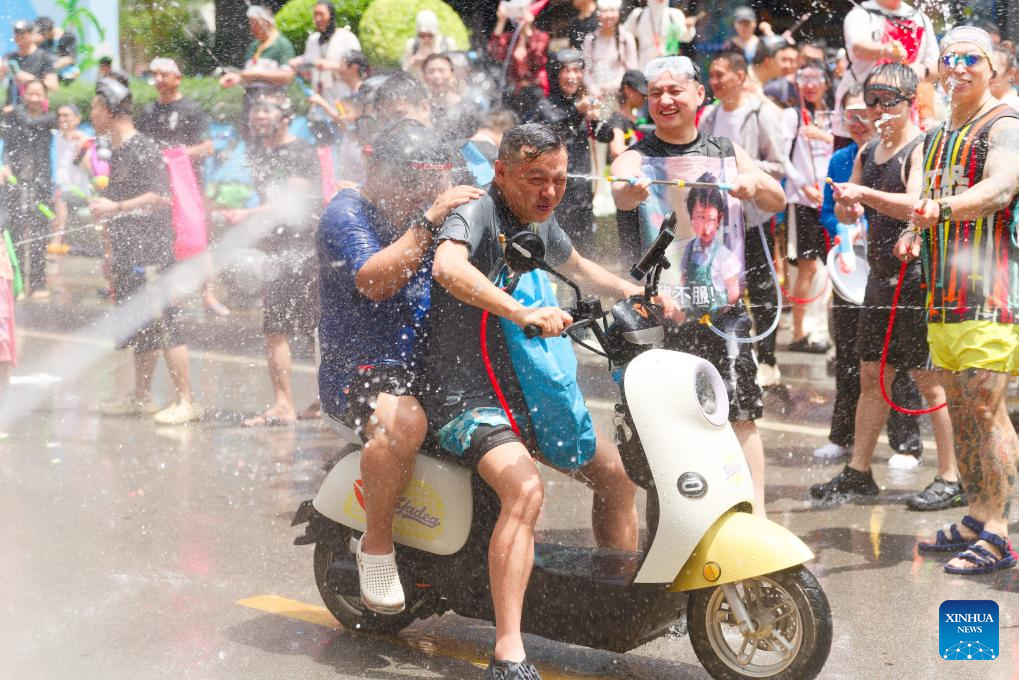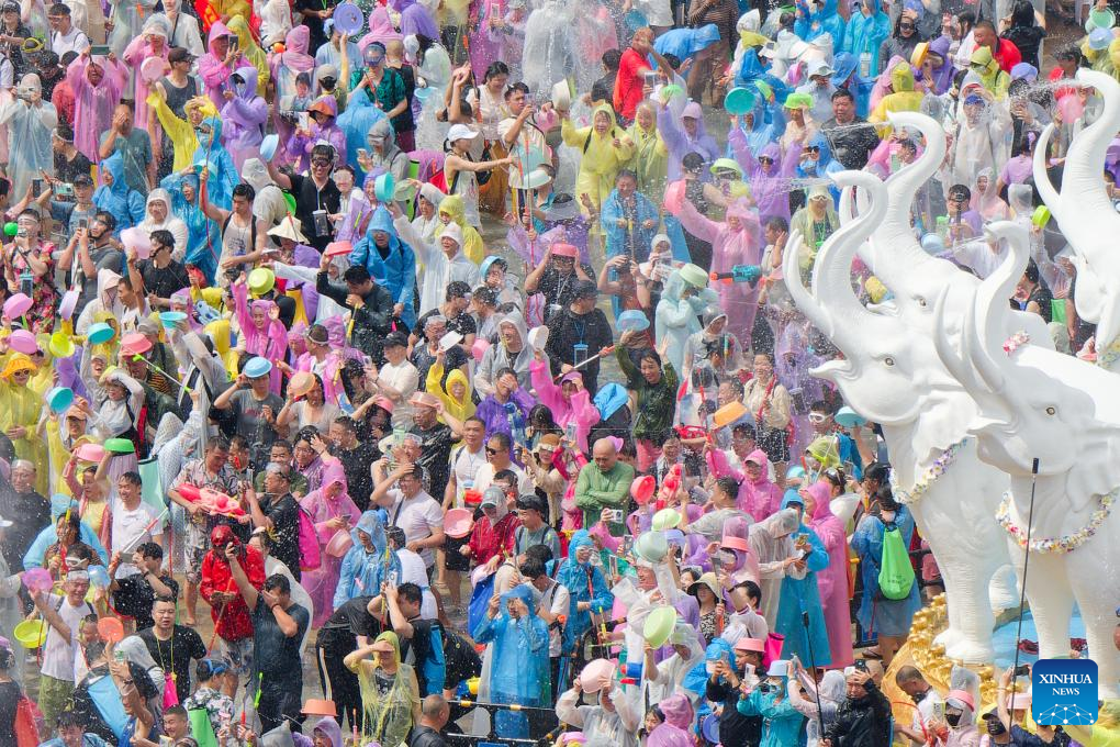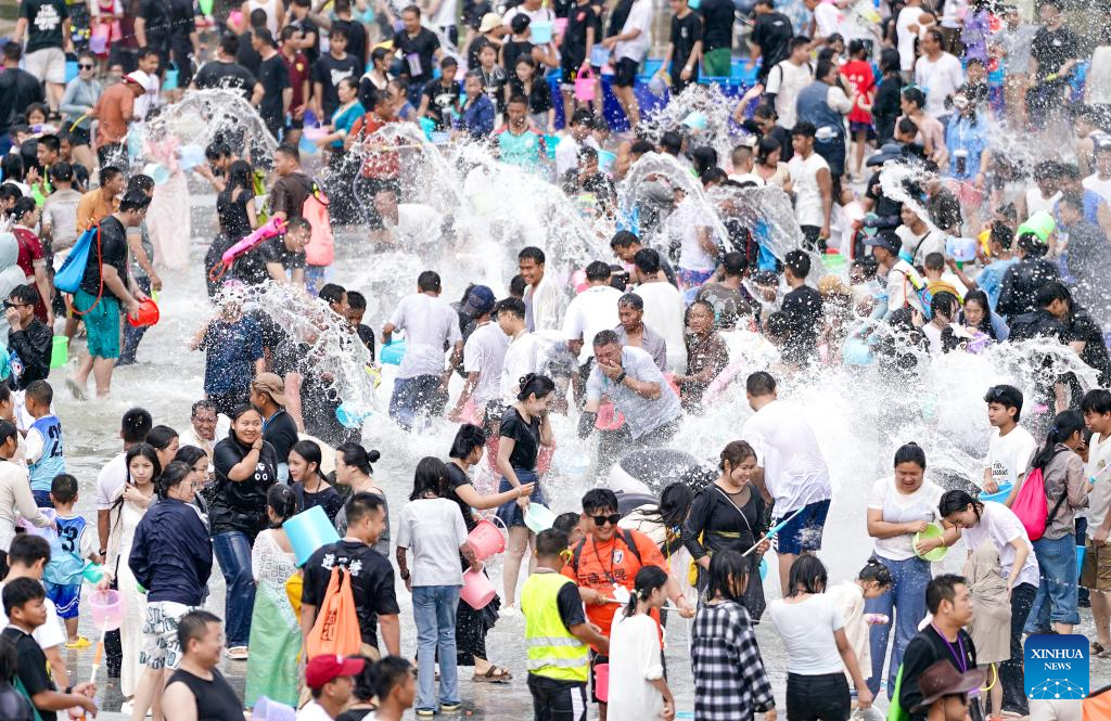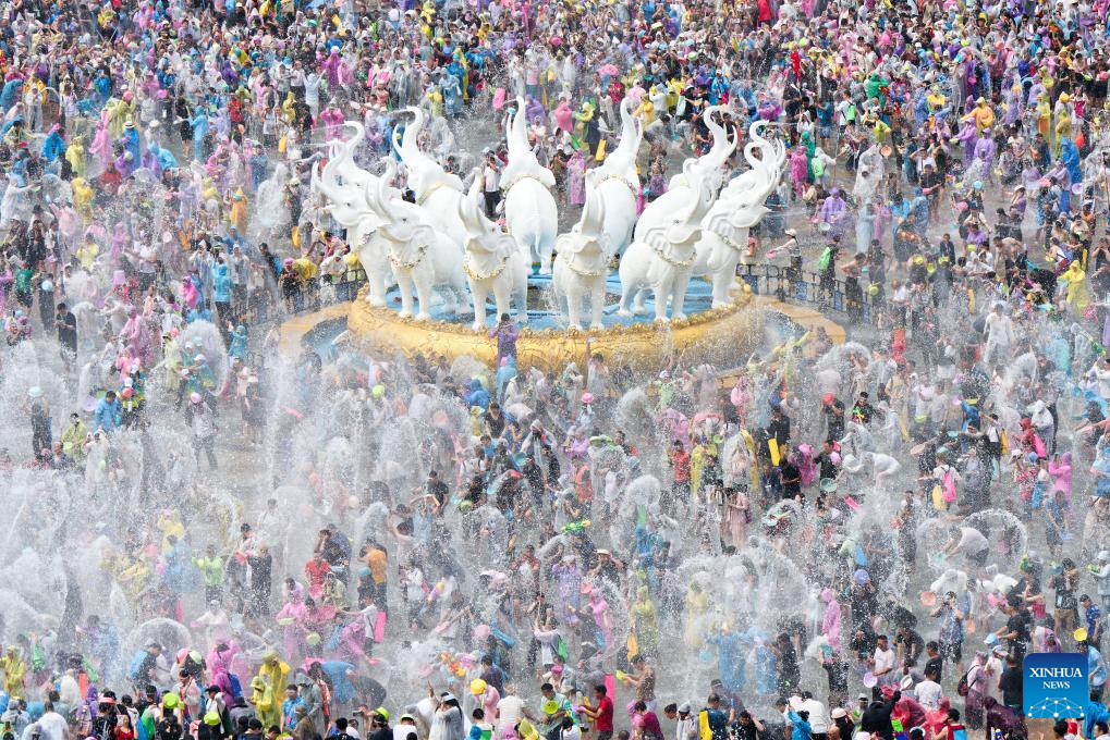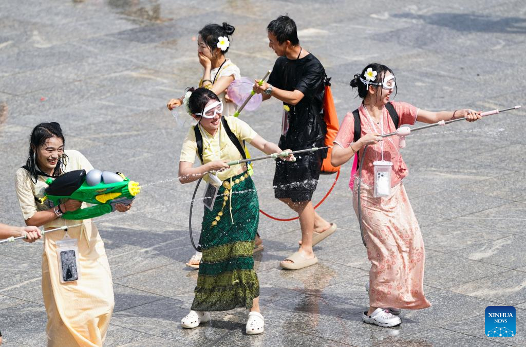 Tourists and local people celebrate the water-splashing festival at a square in Jinghong City, Xishuangbanna Dai Autonomous Prefecture, southwest China's Yunnan Province, April 15, 2025. The water-splashing festival is regarded as one of the most important festivals of ethnic groups in southwest China. During the festival, water is considered an auspicious symbol and people splash water on one another, thereby wishing happiness and good fortune. (Xinhua/Gao Yongwei)