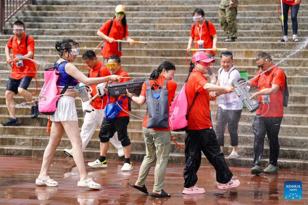Tourists and local people celebrate the water-splashing festival at a square in Gengma Dai and Va Autonomous County of Lincang, southwest China's Yunnan Province, April 15, 2025. The water-splashing festival is regarded as one of the most important festivals of ethnic groups in southwest China. During the festival, water is considered an auspicious symbol and people splash water on one another, thereby wishing happiness and good fortune. (Xinhua/Chen Xinbo)
