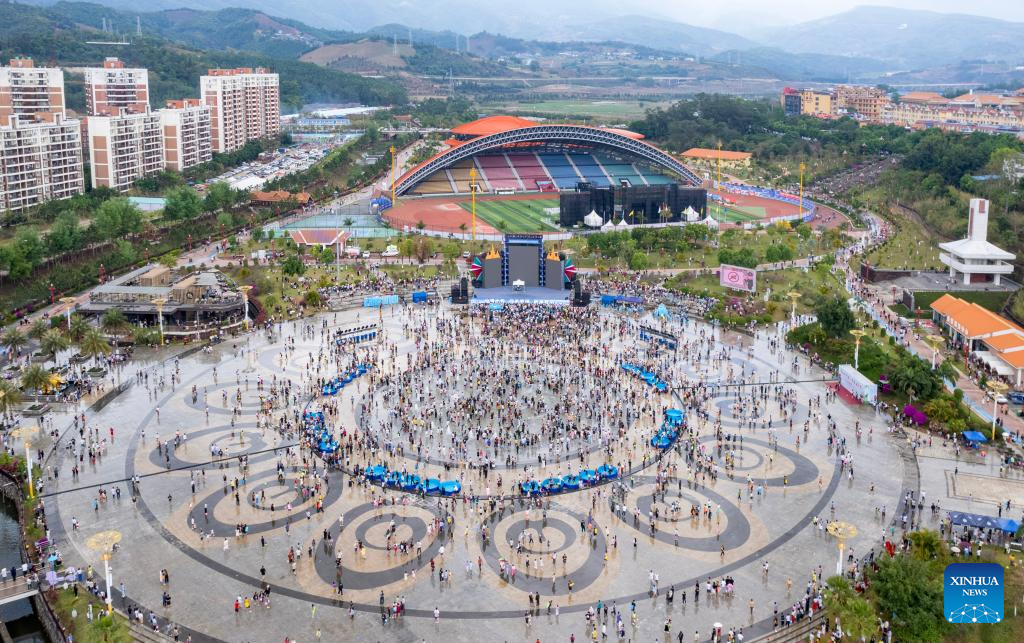 An aerial drone photo taken on April 15, 2025 shows tourists and local people celebrating the water-splashing festival at a square in Gengma Dai and Va Autonomous County of Lincang, southwest China's Yunnan Province. The water-splashing festival is regarded as one of the most important festivals of ethnic groups in southwest China. During the festival, water is considered an auspicious symbol and people splash water on one another, thereby wishing happiness and good fortune. (Xinhua/Chen Xinbo)
