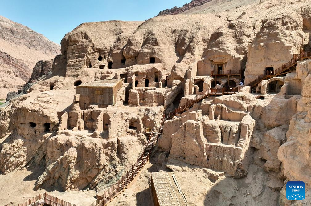 A drone photo shows a view of the Tuyugou Grottoes in Turpan, northwest China's Xinjiang Uygur Autonomous Region May 1, 2025. Two major archaeological sites along the ancient Silk Road opened to the public in northwest China on Thursday, the first day of the May Day holiday, offering new choices for travelers keen to explore the exchanges between Eastern and Western civilizations over a millennium ago. (Xinhua)