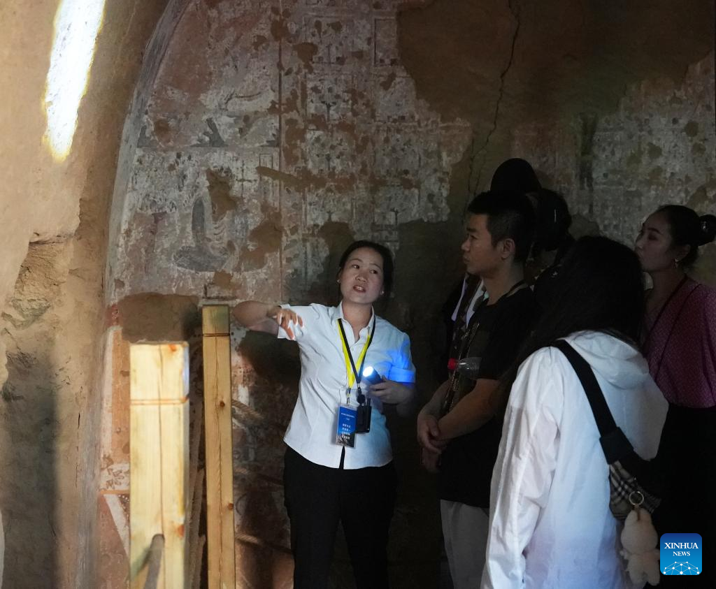 A guide introduces the murals to visitors at the Tuyugou Grottoes in Turpan, northwest China's Xinjiang Uygur Autonomous Region, May 1, 2025. Two major archaeological sites along the ancient Silk Road opened to the public in northwest China on Thursday, the first day of the May Day holiday, offering new choices for travelers keen to explore the exchanges between Eastern and Western civilizations over a millennium ago. (Xinhua)