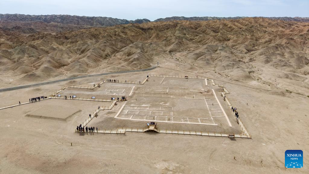 A drone photo shows guests visiting the ruins of Xuanquanzhi in Dunhuang, northwest China's Gansu Province, April 29, 2025. Two major archaeological sites along the ancient Silk Road opened to the public in northwest China on Thursday, the first day of the May Day holiday, offering new choices for travelers keen to explore the exchanges between Eastern and Western civilizations over a millennium ago. (Xinhua/Lang Bingbing)