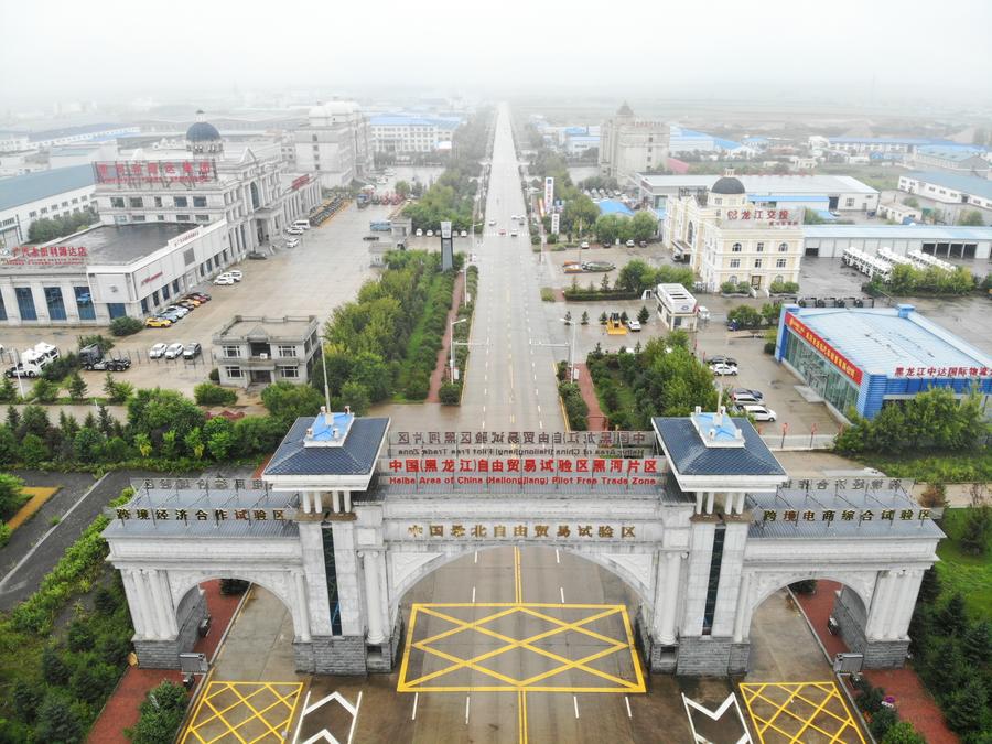This aerial photo taken on Aug, 10, 2023 shows part of the Heihe Area of China (Heilongjiang) Pilot Free Trade Zone in northeast China's Heilongjiang Province. (Xinhua/Wang Song)