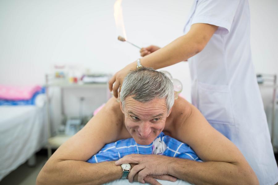 A Russian man receives cupping treatment at a nursing home in Wudalianchi, northeast China's Heilongjiang Province, Oct. 21, 2016. (Xinhua/Wu Zhuang)