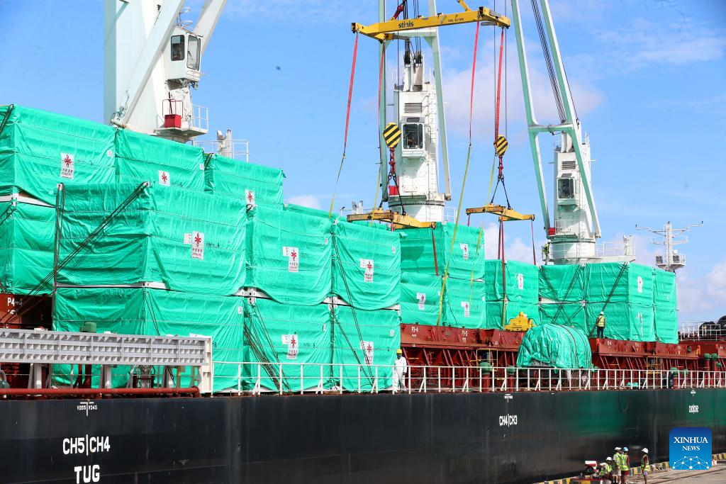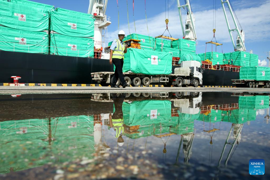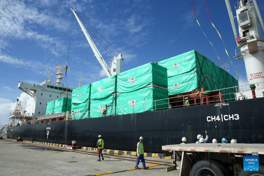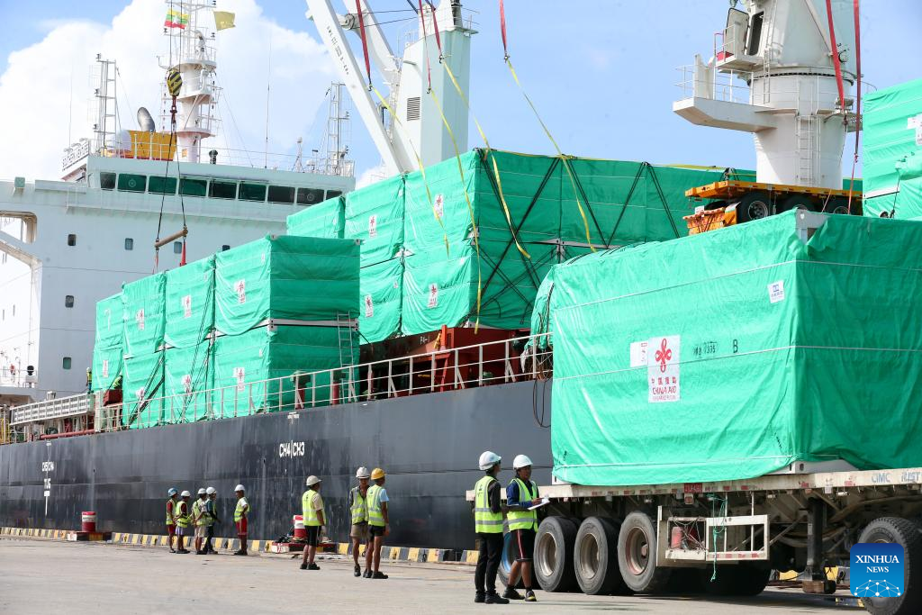 This photo taken on May 14, 2025 shows the 14th batch of emergency humanitarian in-kind assistance dispatched by the Chinese government in Yangon, Myanmar.