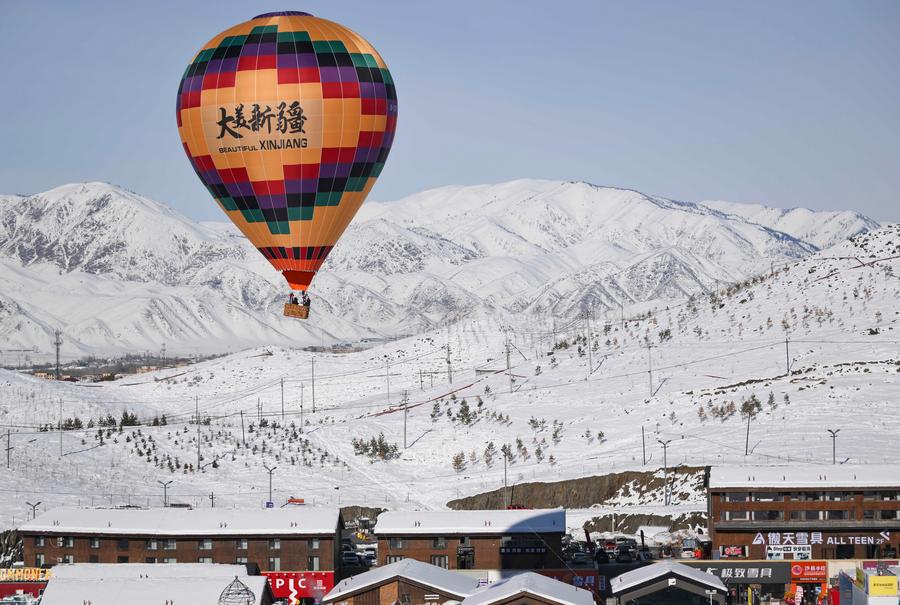 Tourists take a hot air balloon at Jiangjunshan International Ski Resort in Altay, northwest China's Xinjiang Uygur Autonomous Region, Jan. 25, 2025. (Xinhua/Hu Huhu)