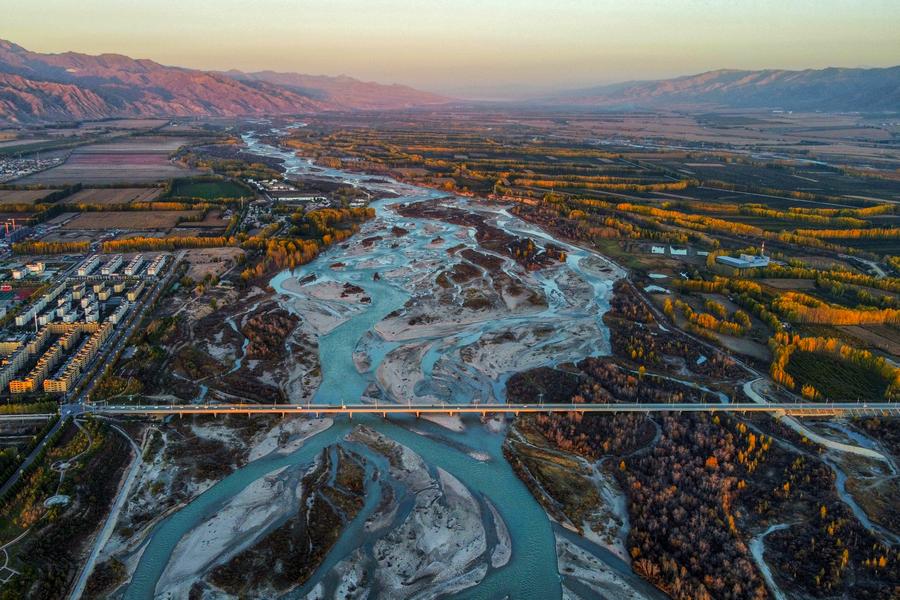 An aerial photo taken on Oct. 9, 2024 shows a view of the Tekes River in Tekes County, Ili Kazak Autonomous Prefecture, northwest China's Xinjiang Uygur Autonomous Region. (Photo by Zhao Fengshou/Xinhua)