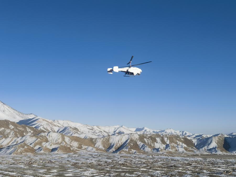 This file photo taken in October 2022 shows a TD550 coaxial unmanned helicopter in a trial flight on the plateau in Hetian, northwest China's Xinjiang Uygur Autonomous Region. (Xinhua)