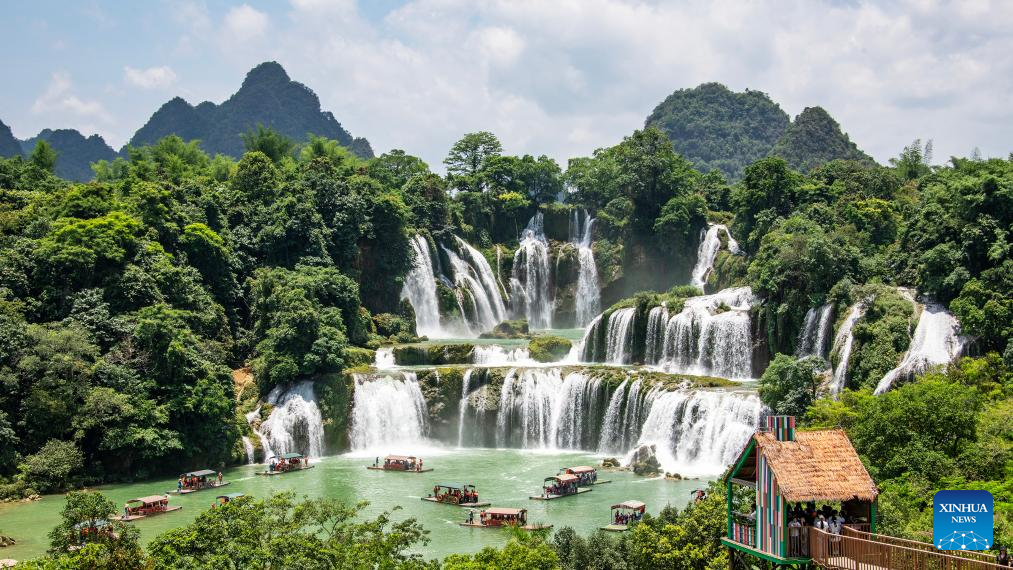 Tourists have fun at Detian Waterfalls scenic area in Daxin County of Chongzuo City, south China's Guangxi Zhuang Autonomous Region, June 1, 2025. People enjoy the 3-day holiday of the Dragon Boat Festival, also called Duanwu Festival which falls on May 31 this year, via various activities across the country. (Photo by Zhao Jingwu/Xinhua)
