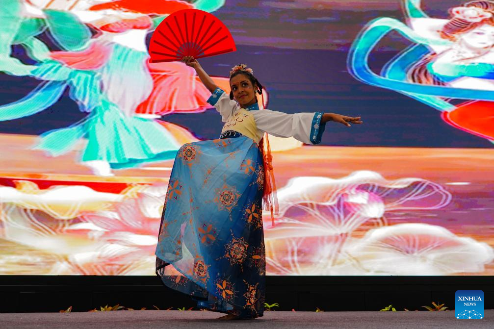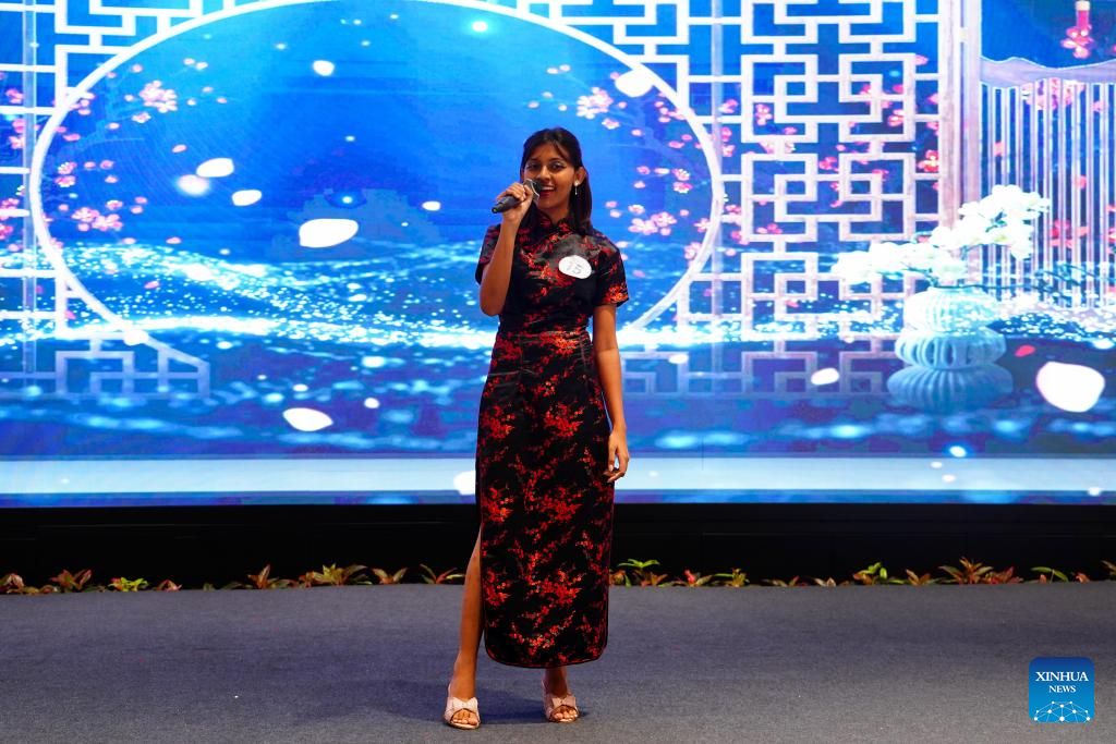 A contestant performs during the 24th "Chinese Bridge" Chinese Proficiency Competition for Foreign College Students in Colombo, Sri Lanka, June 3, 2025. Two Sri Lankan university students won first prize at the 24th "Chinese Bridge" Chinese Proficiency Competition for Foreign College Students, which was held at Colombo Port City on Tuesday. The event, held by the Chinese Embassy in Sri Lanka, was organized by the Confucius Institute at the University of Kelaniya in partnership with CHEC Port City Colombo (Pvt) Ltd. (Xinhua/Chen Dongshu)