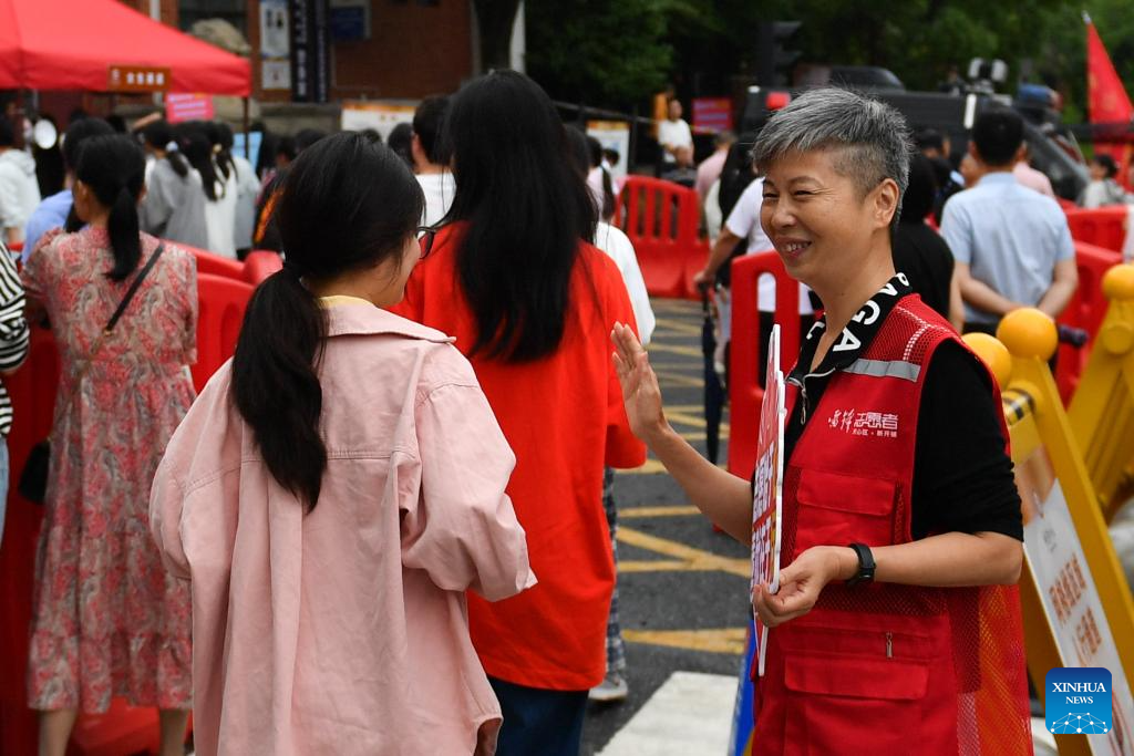 Volunteers maintain order outside a national college entrance examination site in Changsha, central China's Hunan Province, June 8, 2025. Tianxin District of Changsha has organised volunteers to provide help for students and their parents at multiple local examination sites during this year's national college entrance exam. (Xinhua/Chen Zhenhai)