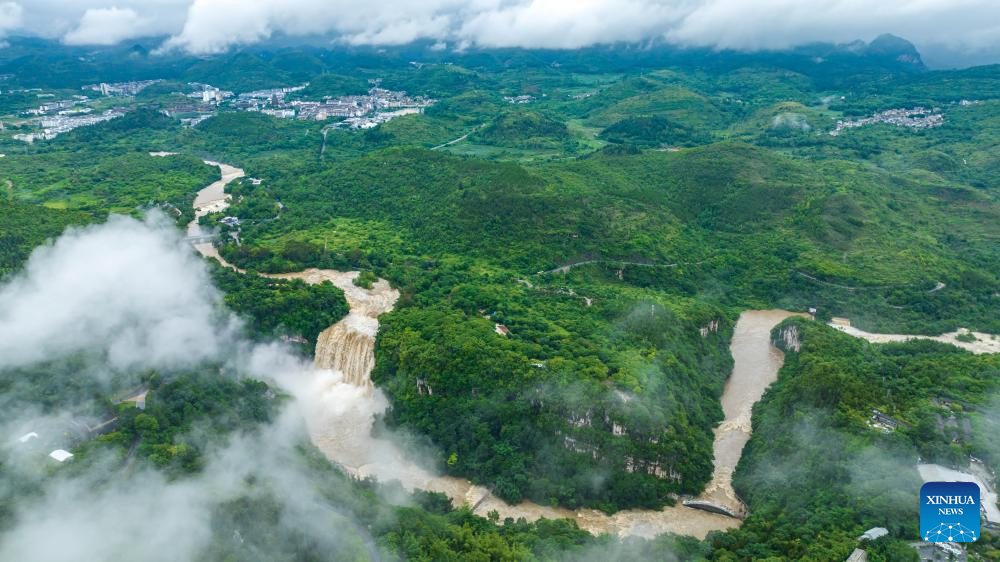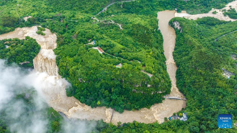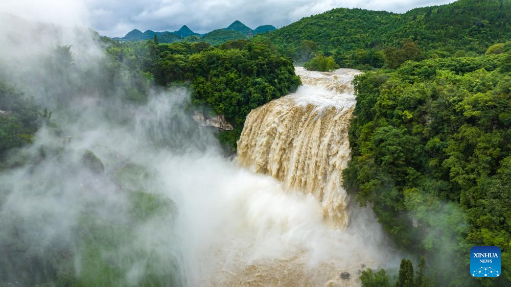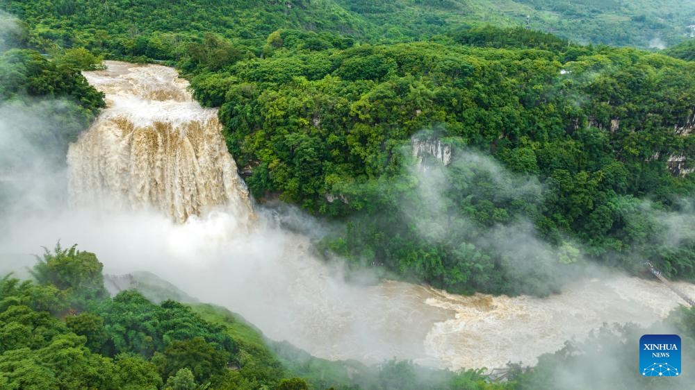 An aerial drone photo taken on June 26, 2025 shows a view of Huangguoshu Waterfall in Anshun, southwest China's Guizhou Province. Affected by sustained rainfall, the Huangguoshu Waterfall on Thursday saw its maximum flow in this year's flood season, with the flow rate reaching 528 cubic meters per second. (Photo by Chen Xi/Xinhua)