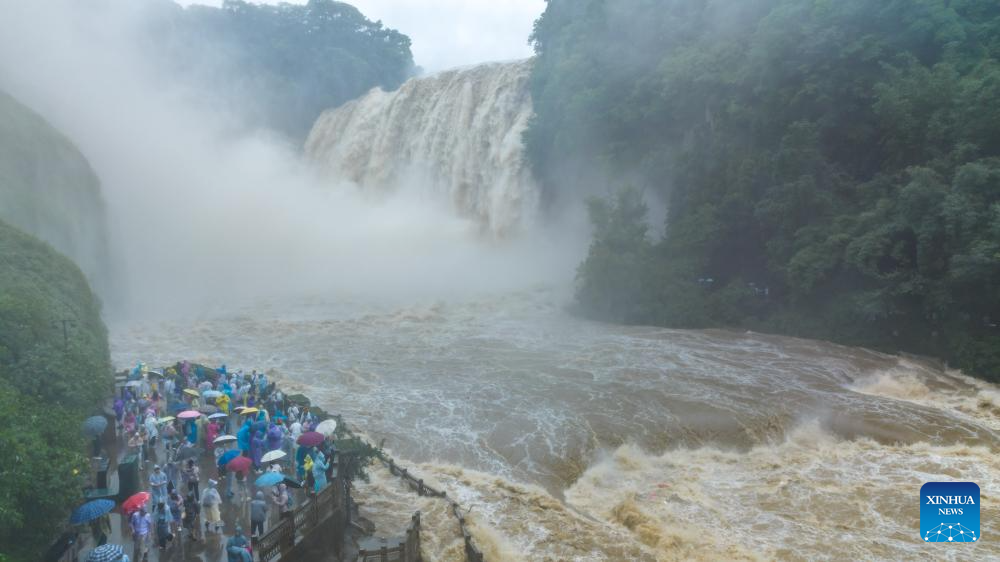 An aerial drone photo taken on June 26, 2025 shows tourists enjoying the view of Huangguoshu Waterfall in Anshun, southwest China's Guizhou Province. Affected by sustained rainfall, the Huangguoshu Waterfall on Thursday saw its maximum flow in this year's flood season, with the flow rate reaching 528 cubic meters per second. (Photo by Chen Xi/Xinhua)