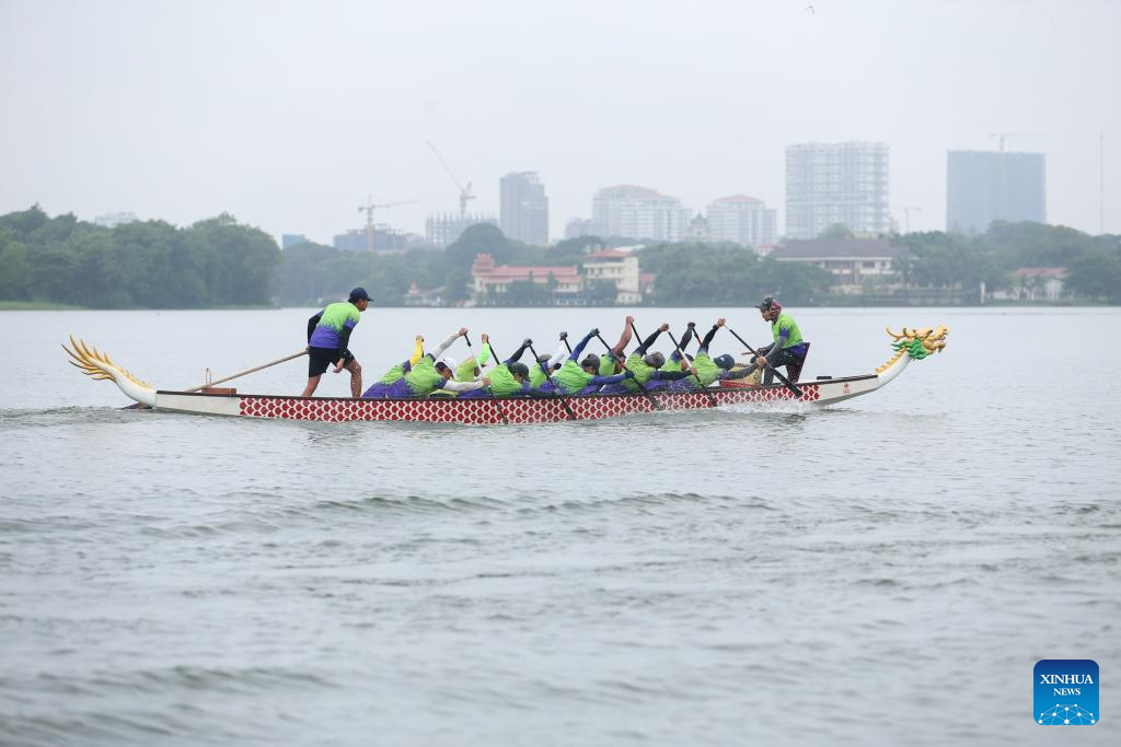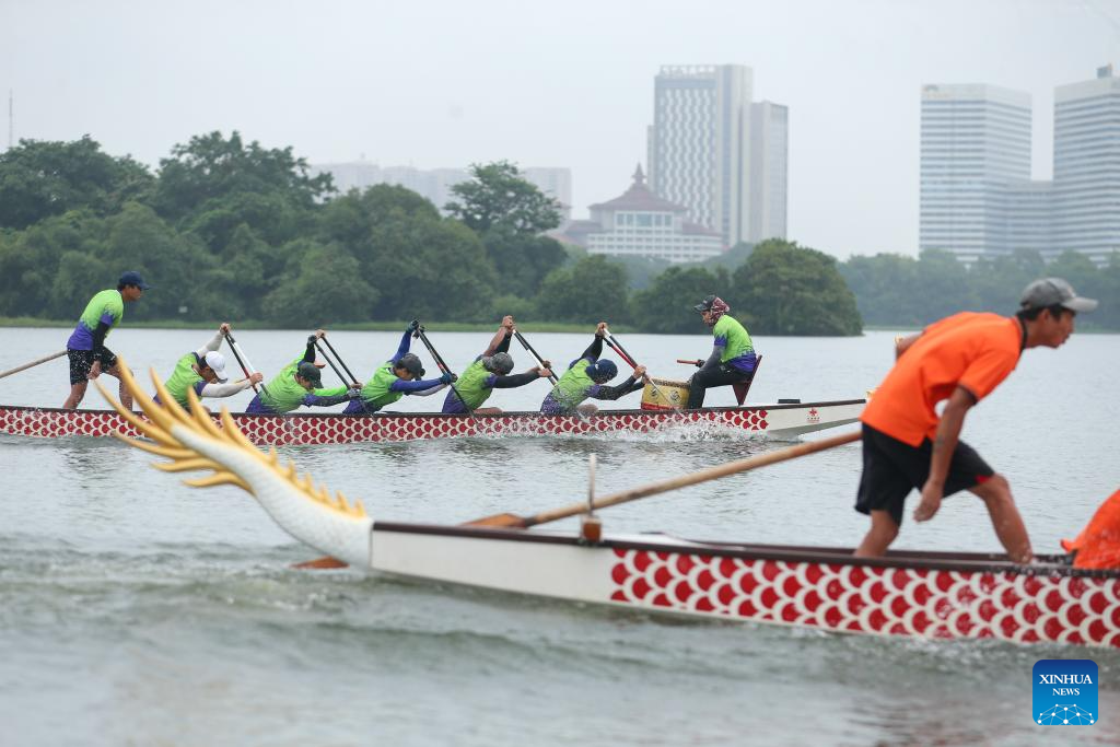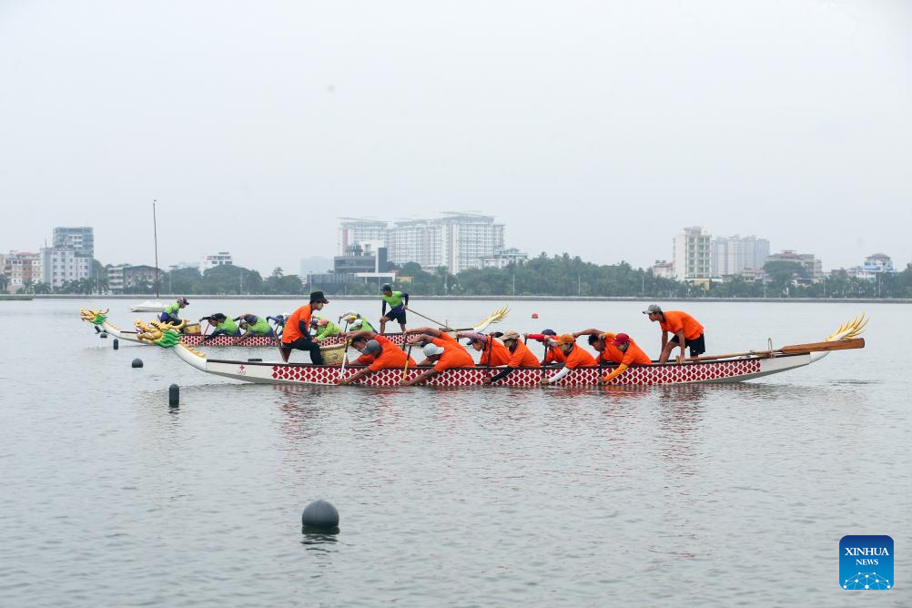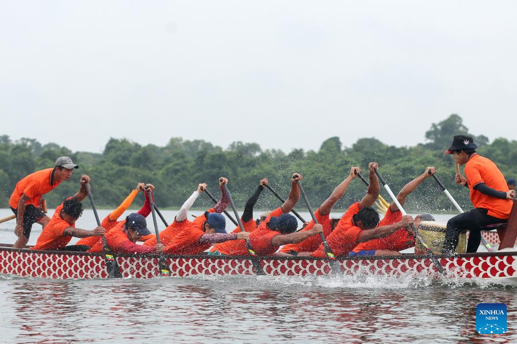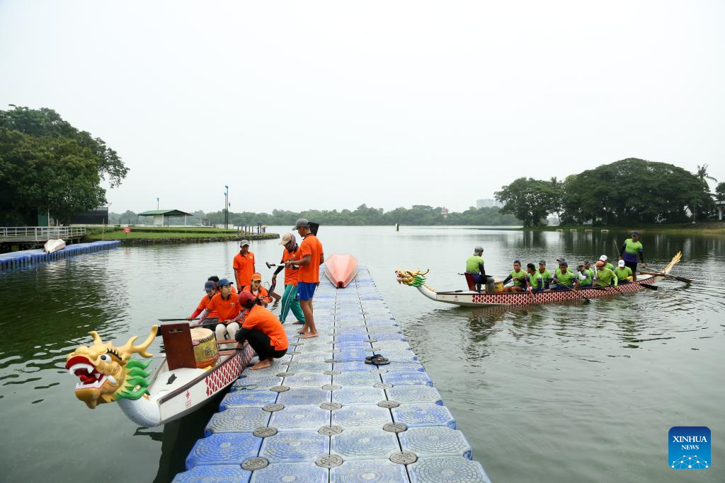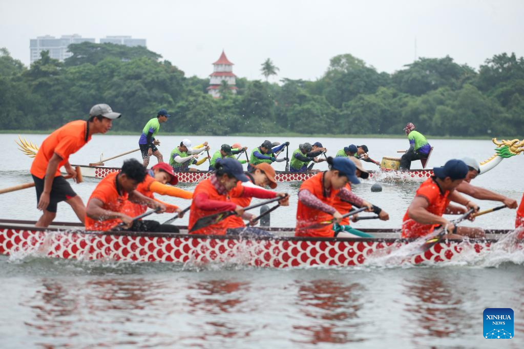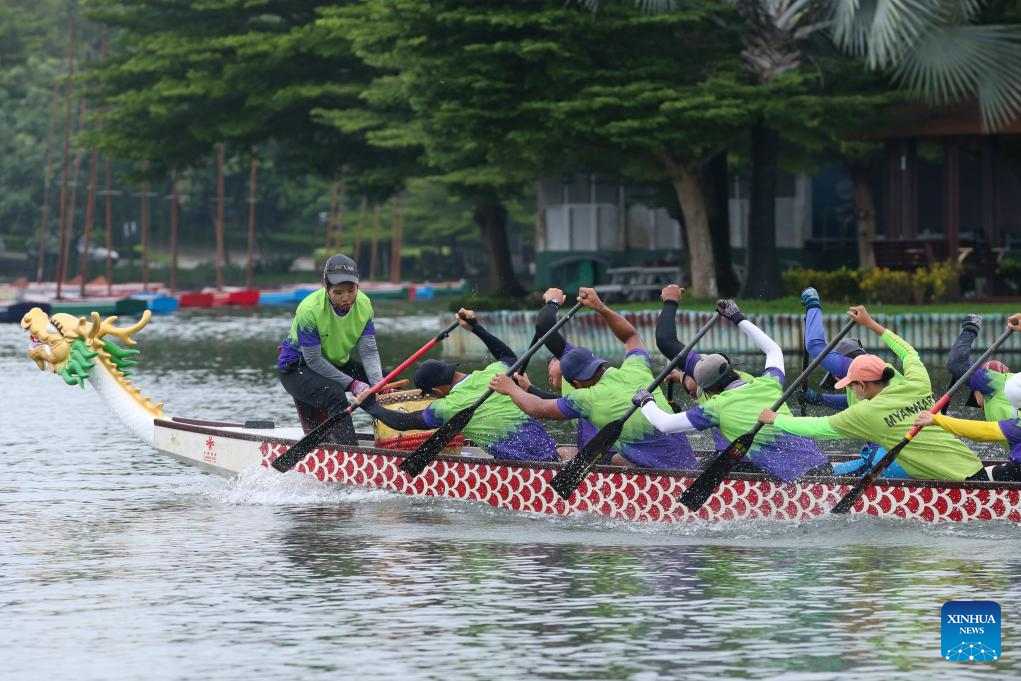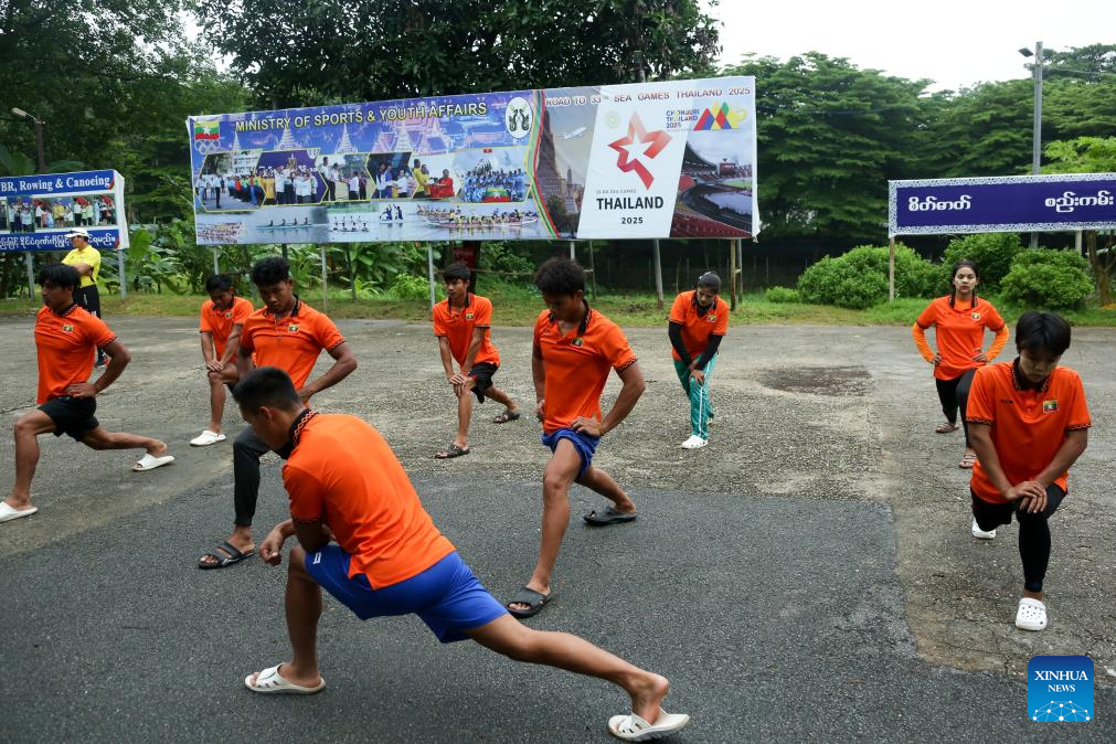 Members of Myanmar's national dragon boat team attend a training session for the Chengdu 2025 World Games, in Yangon, Myanmar, July 28, 2025.(Photo by Myo Kyaw Soe/Xinhua)