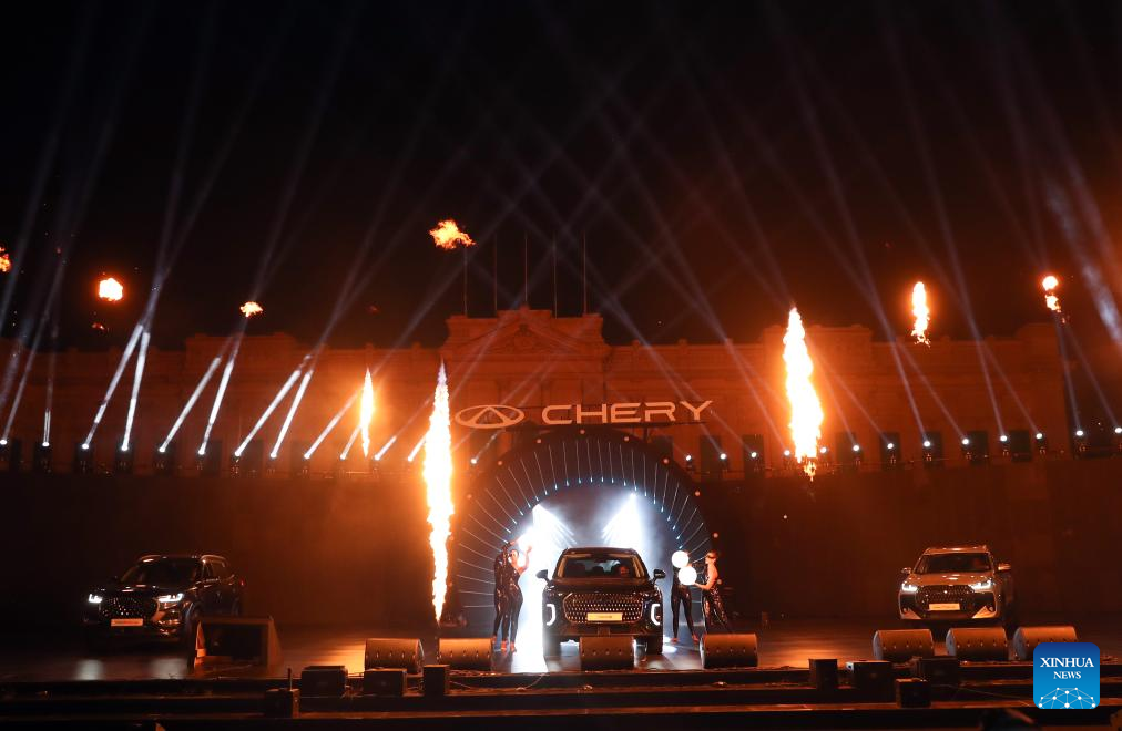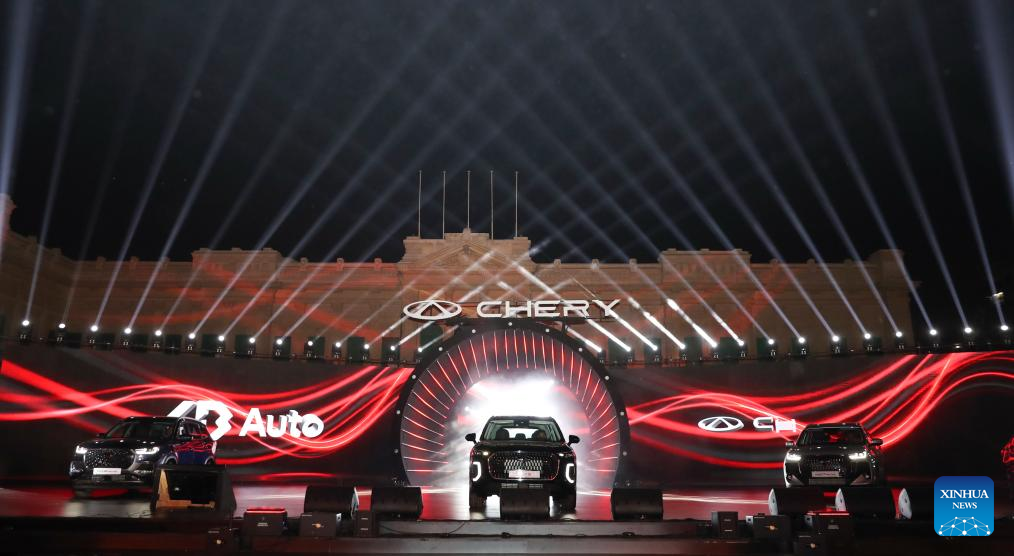 Photo taken on July 28, 2025 shows a new Chery model during a launching ceremony in Cairo, Egypt. Chinese automaker Chery unveiled five new models here on Monday as part of its expansion into the Egyptian market. (Xinhua/Sui Xiankai)