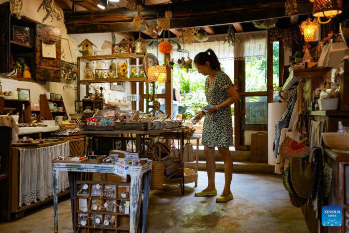A tourist shops at a souvenir store in Leju Village in Xishan District of Kunming City, southwest China's Yunnan Province, July 27, 2025. Leju Village in Kunming is an ancient Yi ethnic village with a history of over 600 years. Its name, derived from the Yi language, means "the village at the foot of the rocky mountain," and it is renowned for its unique residential architecture.(Xinhua/Chen Xinbo)