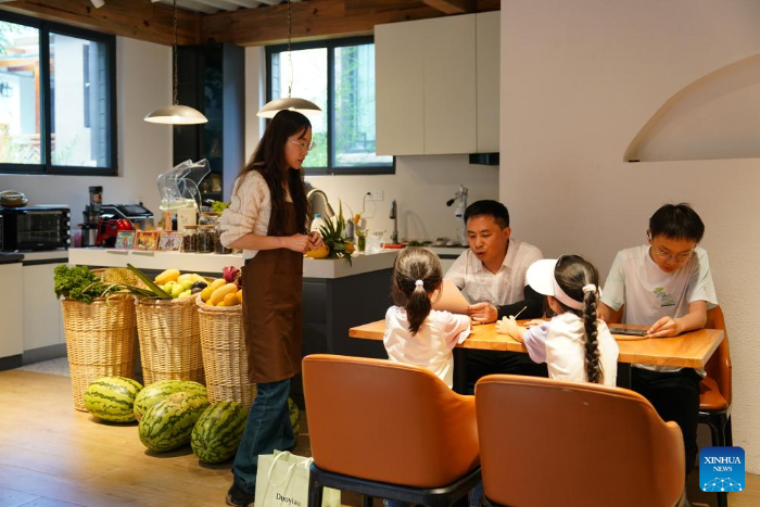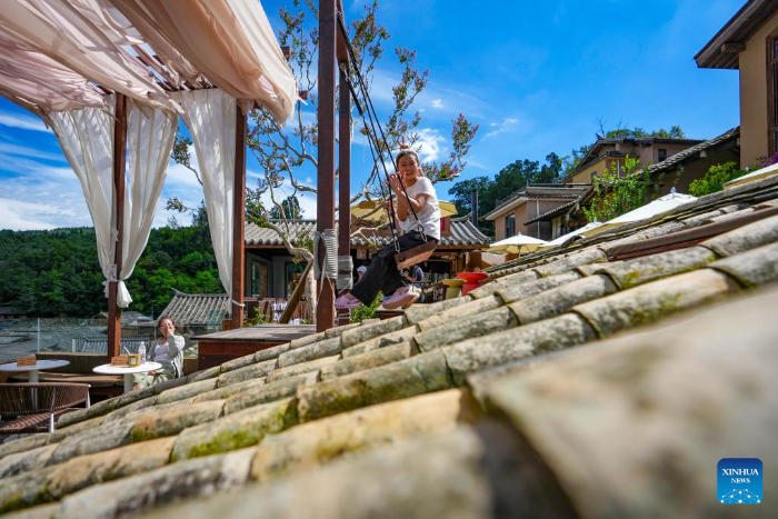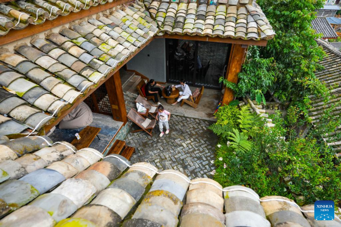 Tourists are pictured at a homestay in Leju Village in Xishan District of Kunming City, southwest China's Yunnan Province, July 23, 2025. Leju Village in Kunming is an ancient Yi ethnic village with a history of over 600 years. Its name, derived from the Yi language, means "the village at the foot of the rocky mountain," and it is renowned for its unique residential architecture.(Xinhua/Chen Xinbo)