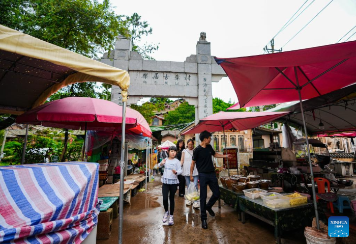 Tourists visit a wet market in Leju Village in Xishan District of Kunming City, southwest China's Yunnan Province, July 27, 2025. Leju Village in Kunming is an ancient Yi ethnic village with a history of over 600 years. Its name, derived from the Yi language, means "the village at the foot of the rocky mountain," and it is renowned for its unique residential architecture.(Xinhua/Chen Xinbo)