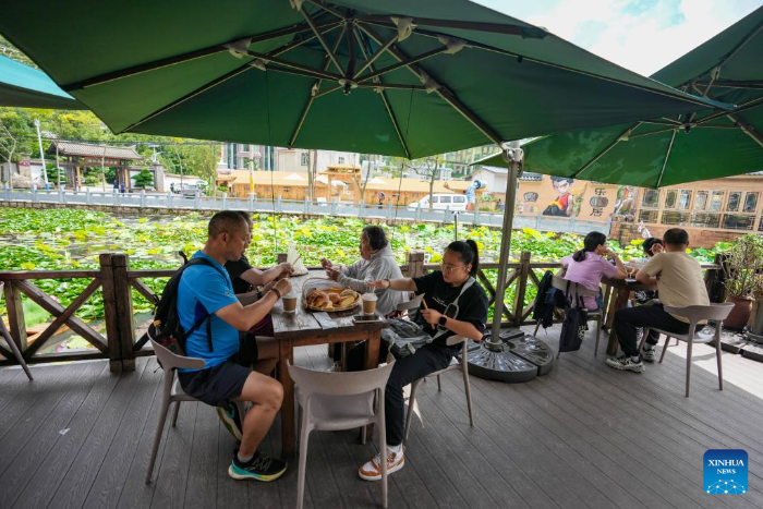 Tourists are pictured at a cafe in Leju Village in Xishan District of Kunming City, southwest China's Yunnan Province, July 27, 2025. Leju Village in Kunming is an ancient Yi ethnic village with a history of over 600 years. Its name, derived from the Yi language, means "the village at the foot of the rocky mountain," and it is renowned for its unique residential architecture.(Xinhua/Chen Xinbo)