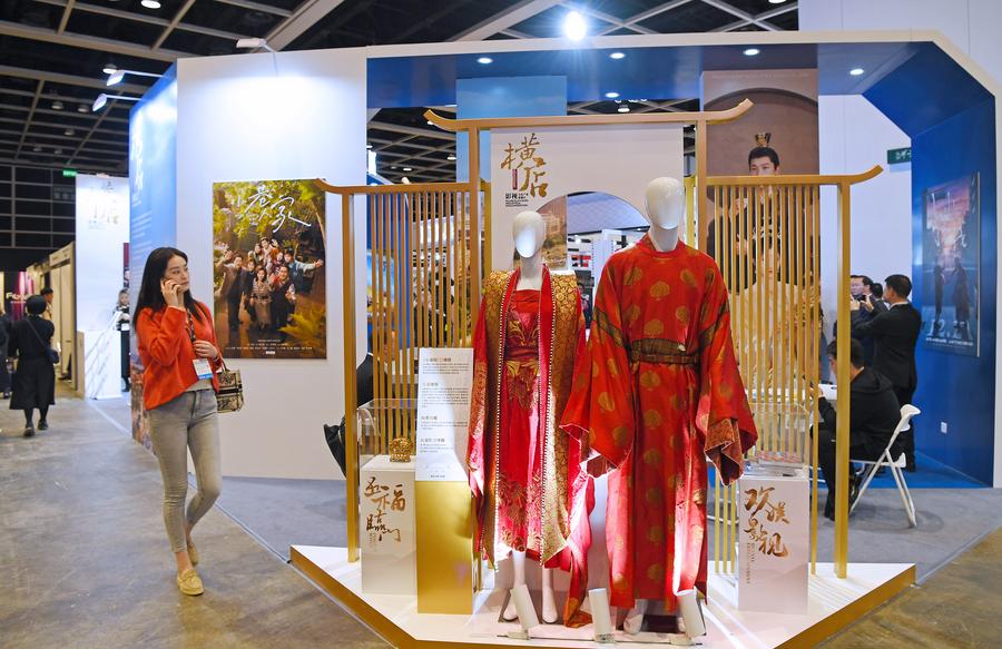 Film and television clothing is displayed at the booth of Hengdian cinematic and cultural industry cluster zone at the Hong Kong International Film and TV Market (FILMART), in Hong Kong, March 17, 2025. [Photo/Xinhua]