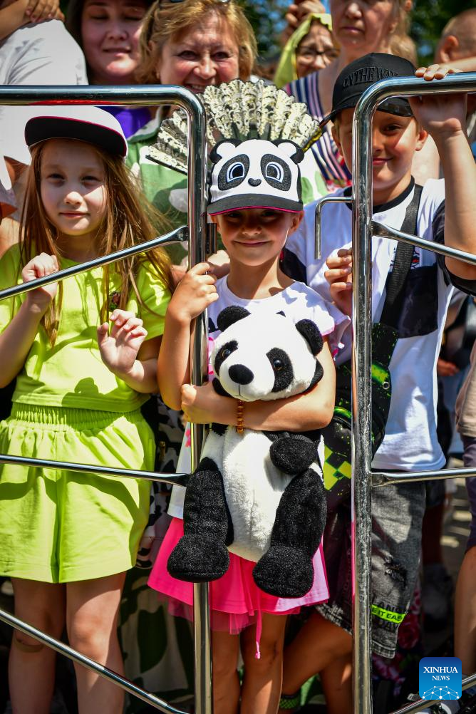 People attend a birthday celebration for giant panda Dingding at the Moscow Zoo in Moscow, Russia, on July 30, 2025. The Moscow Zoo held an event to celebrate giant panda Dingding's eighth birthday on Wednesday. (Xinhua/Zhang Chaoqun)