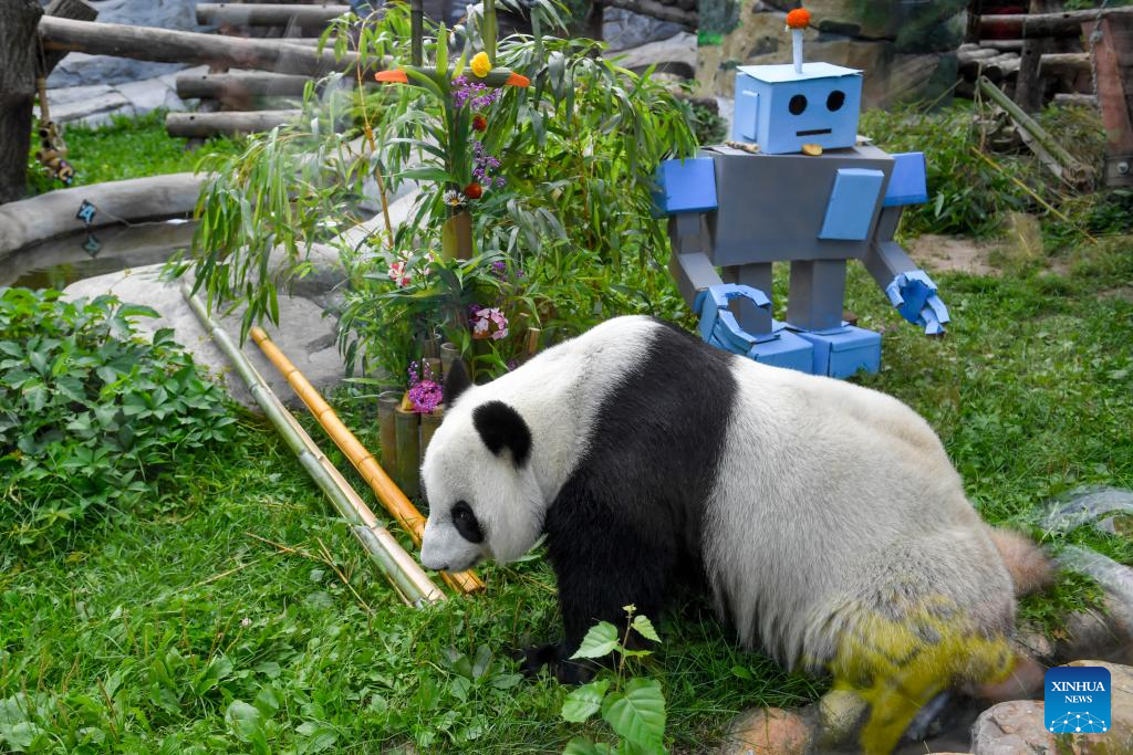 Giant panda Dingding plays under birthday decorations at the Moscow Zoo in Moscow, Russia, on July 30, 2025. The Moscow Zoo held an event to celebrate giant panda Dingding's eighth birthday on Wednesday. (Xinhua/Zhang Chaoqun)