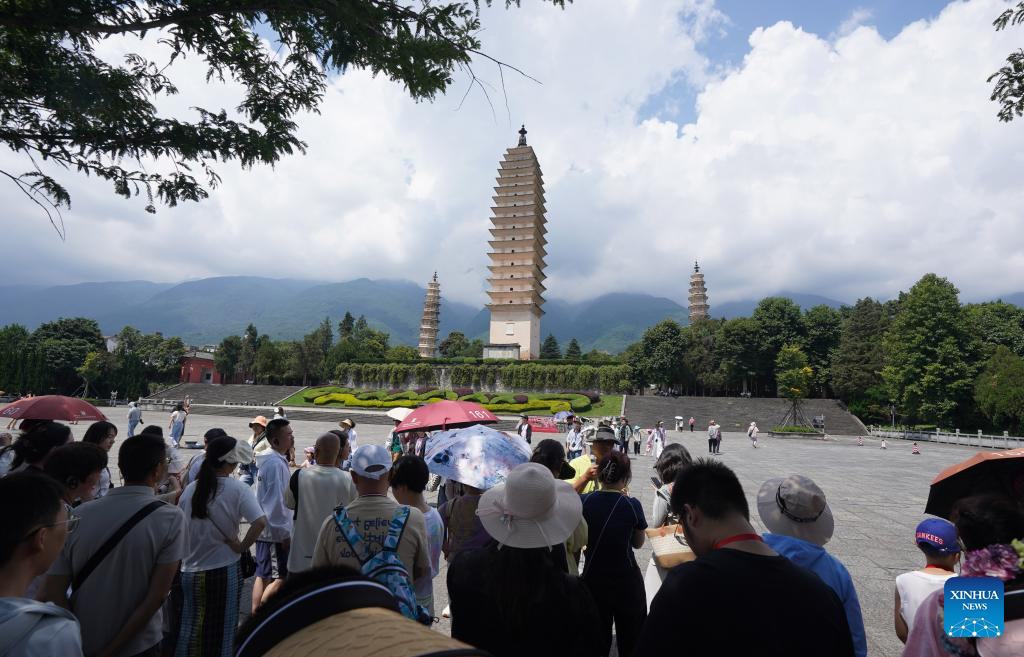 Tourists visit the Three Pagodas scenic area in Dali Bai Autonomous Prefecture, southwest China's Yunnan Province, July 30, 2025. (Photo by Liang Zhiqiang/Xinhua)