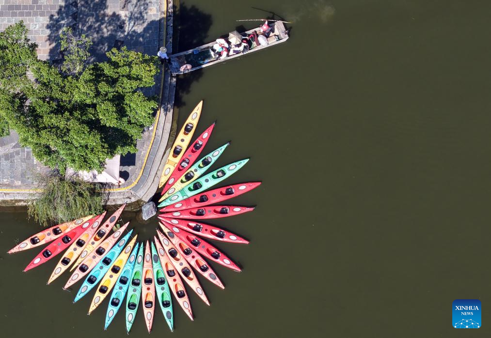 An aerial drone photo shows tourists taking a boat in Xihu wetland park in Eryuan County, Dali Bai Autonomous Prefecture, southwest China's Yunnan Province, July 29, 2025. (Photo by Liang Zhiqiang/Xinhua)