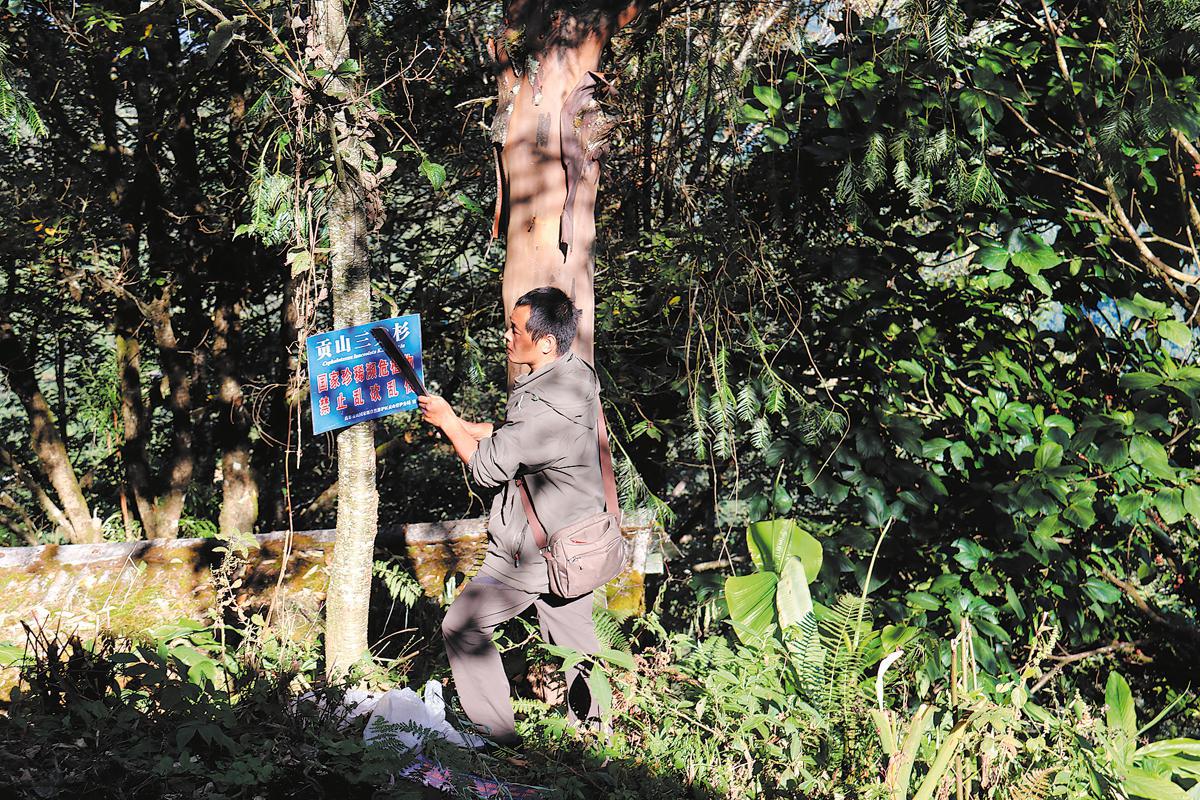 A worker hangs a sign marking an endangered tree in Yunnan province. CHINA DAILY