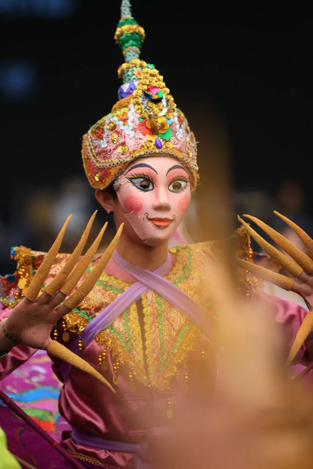 At the opening ceremony, the provincial intangible cultural heritage—Dai Divine Peacock Dance—captivated the audience. Two inheritors, adorned with golden cloud-patterned masks and resplendent winged-shoulder robes, carried bamboo-crafted bird-shaped frames on their backs as they danced gracefully to the melodious music. With perfect harmony, they blended the avian creatures' agile movements with the Dai martial art’s dynamic strength-kneeling reverently, fluttering wings delicately, trotting briskly-their every gesture vividly resurrecting the mythical phoenix couple's unwavering devotion and vibrant vitality.
