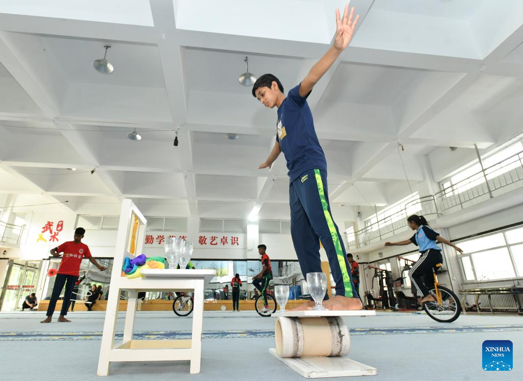 Trainees from Bangladesh practice at Hebei Wuqiao Acrobatic Art School in Wuqiao County, north China's Hebei Province, Aug. 20, 2025. More than 20 trainees from Bangladesh have been training hard in recent days at the Hebei Wuqiao Acrobatic Art School in Wuqiao County, dubbed the "cradle of Chinese acrobatics." They are scheduled to conclude their study tour in early September and return home as acrobatic performers or educators.
