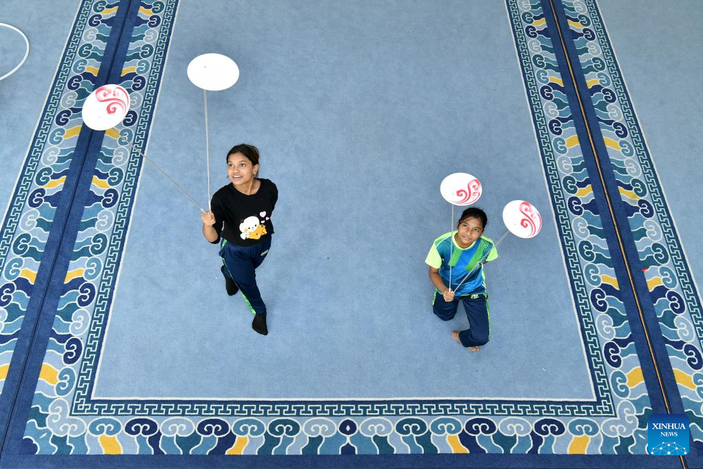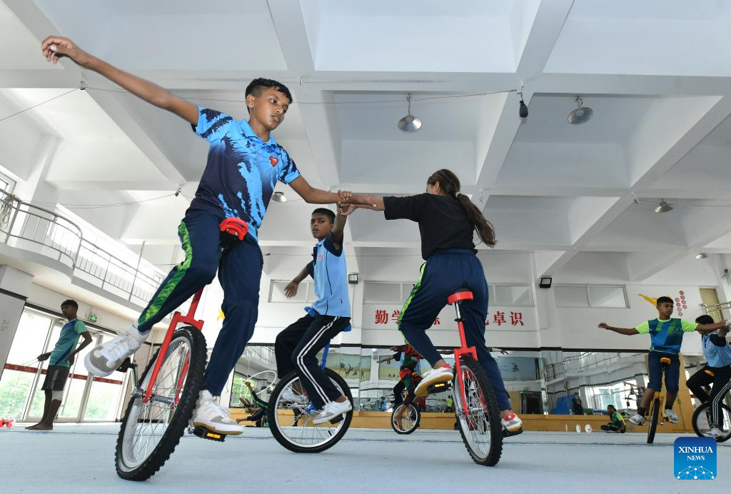 Trainees from Bangladesh practice at Hebei Wuqiao Acrobatic Art School in Wuqiao County, north China's Hebei Province, Aug. 20, 2025. (Xinhua/Mu Yu)