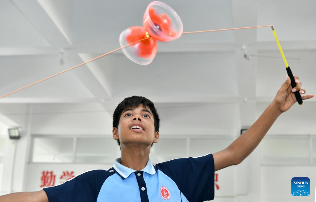 A trainee from Bangladesh practices at Hebei Wuqiao Acrobatic Art School in Wuqiao County, north China's Hebei Province, Aug. 20, 2025. (Xinhua/Mu Yu)
