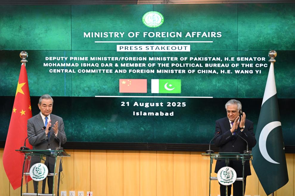 Chinese Foreign Minister Wang Yi, also a member of the Political Bureau of the Communist Party of China Central Committee, holds a joint press conference with Pakistani Deputy Prime Minister and Foreign Minister Mohammad Ishaq Dar after the Sixth Round of China-Pakistan Foreign Ministers' Strategic Dialogue in Islamabad, Pakistan, Aug. 21, 2025. (Photo by Ahmad Kamal/Xinhua)