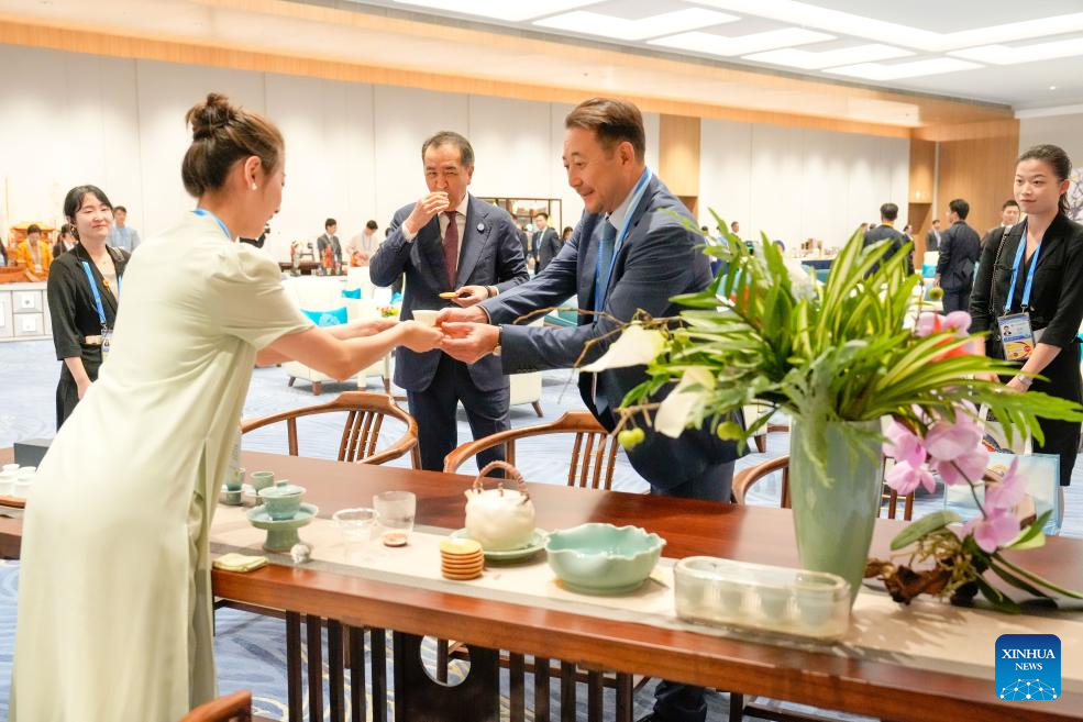 Guests experience Chinese tea culture before a welcoming banquet at the Meijiang Convention and Exhibition Center in Tianjin, north China, Aug. 31, 2025. Chinese President Xi Jinping and his wife, Peng Liyuan, on Sunday hosted a banquet in China's port city of Tianjin to welcome international guests who are here to attend the Shanghai Cooperation Organization (SCO) Summit 2025.